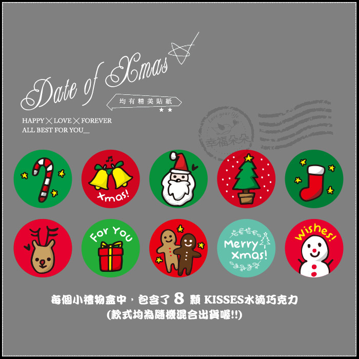 巧克力底部均貼有聖誕主題貼紙喔! 每個小禮物盒中,包含了8顆水滴巧克力,並為您繫上Q版XMAS小鹿吊牌及紅色緞帶🎁 讓這份小禮物更顯這份心意💗 與親友們分享甜蜜和浪漫的好滋味,是最好最Perfect的時光😋 皆為混合口味及隨機款式出貨,恕不挑口味及款式唷~