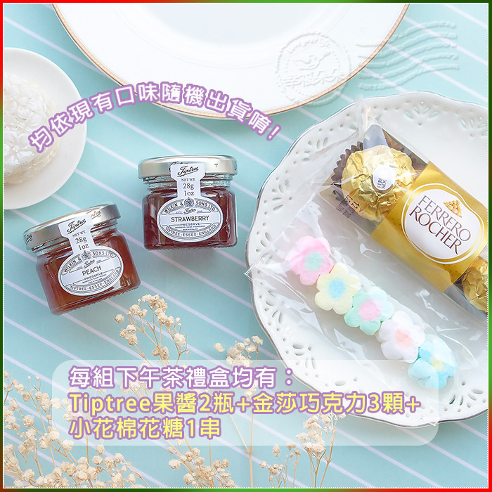 每組下午茶禮盒均有:果醬2瓶+金莎巧克力3顆+小花棉花糖1串 外盒會手工為您繫上2cm寬的暗紅色緞帶做點綴,相當喜氣浪漫喔! 同時每組禮盒均會加贈1個粉紅玫瑰小提袋,就是要你送禮超到位~
