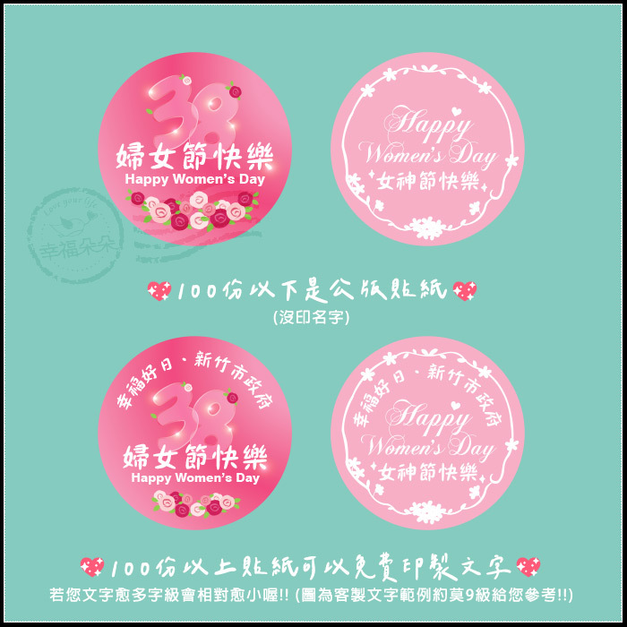 *單筆訂購滿100份以上可挑1款於貼紙上免費加印客製文字! *單筆訂購滿200份以上可挑2款於貼紙上免費加印客製文字! *接單後,公版現貨約3天內交件,若是客製貼紙則約7-10天內交貨! ※訂購滿百份者若欲客製加印文字請詳閱以下注意事項↓↓↓ 1. 請務必記得要留言備註您的文字內容喔! 未備註者將以混2款「公版」出貨 !!! 2. 若您文字愈多字級會相對愈小喔!! (圖6客製文字約莫9級給您參考!!) 🧡需提前3周以上預訂,請先留言使用日期及數量,確認後再下訂,謝謝您!! 採接單後新鮮現做於使用日期前2-3天交貨(趕件者請先詢問時間)