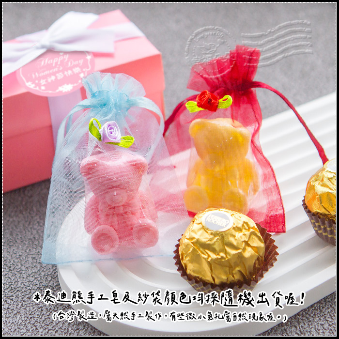 以可愛的「泰迪熊」作為造型的手工精油皂,採用美國SOS香水級的香精製造,植物性皂基,每一顆香皂皆有覆膜喔,品質有保障。 熊皂共有六種顏色:粉紅、粉紫、粉橘、粉藍、淡黃、藍綠色,搭配玫瑰紗袋,真是美呆了🥰 (熊皂及紗袋均採混色出貨喔!!) 每份小禮盒均有 泰迪熊手工皂1個 + 金莎巧克力1顆 ! 每顆金莎均包著香濃可口的巧克力及榛果顆粒,超好吃😋 送給每一位女神真的剛剛好棒棒der 吊牌共有2款可挑:婦女節快樂吊牌、女神節快樂吊牌 保存方式:存放於乾燥陰涼處即可 保存期限:至少半年以上