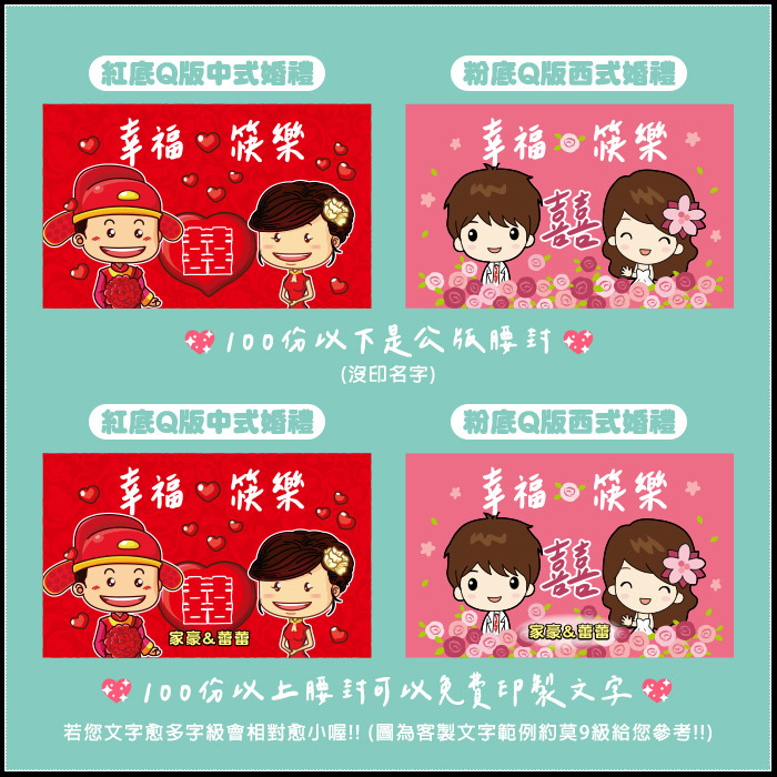 .攜帶方便 .不銹鋼材質,真空鍍鈦 .鏡面拋光工藝 每份餐具組皆含有葡萄牙叉子1支、湯匙1支、筷子1雙 攜帶方便.不銹鋼材質.鏡面拋光工藝.清洗方便 並貼有幸福朵朵獨家設計電繪Q版婚禮娃娃插圖腰封🩷 super勾椎🫠 腰封共有2款可挑:紅底Q版中式婚禮、粉底Q版西式婚禮🧡 餐具共有4種顏色可挑:白金、綠金、藍金、粉金、紅金、黑金 🧡100包以下是公版腰封(無客製文字) 🧡100包以上可挑選①款腰封免費印製文字 🧡200包以上可挑選②款腰封免費印製文字