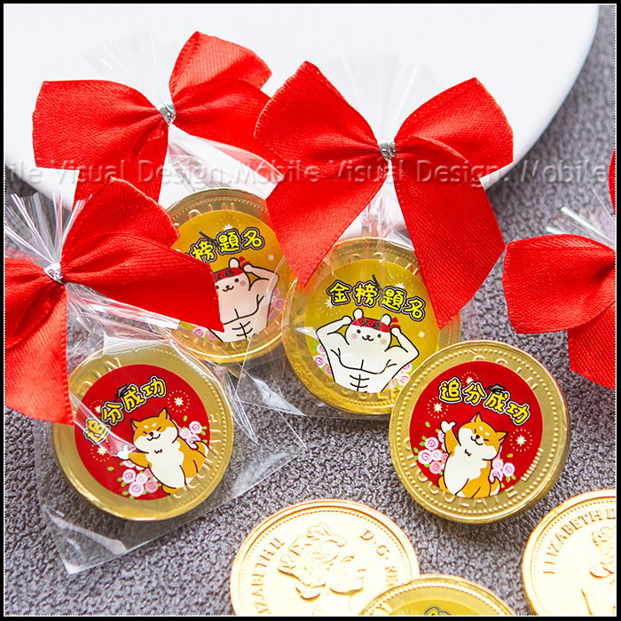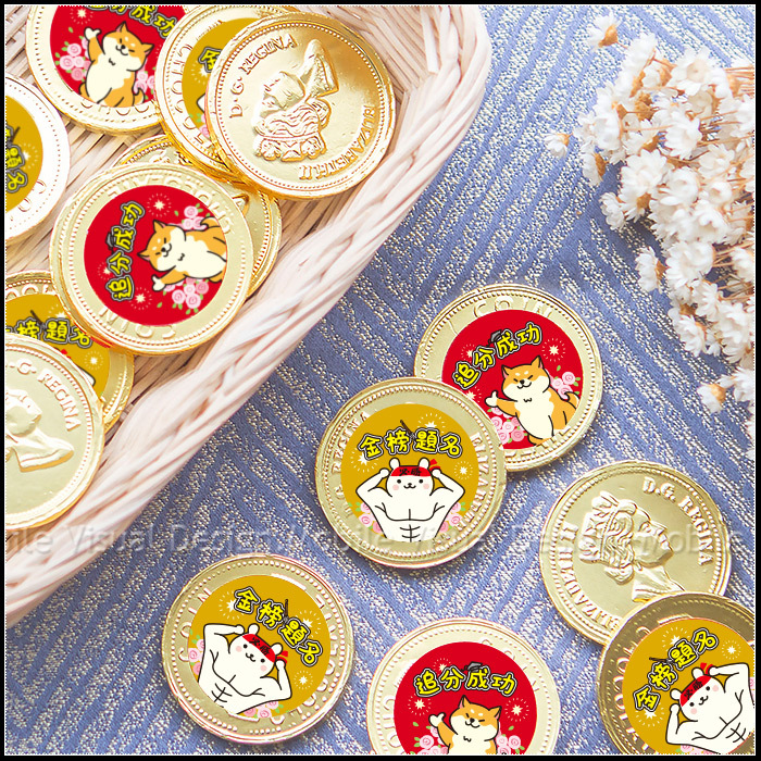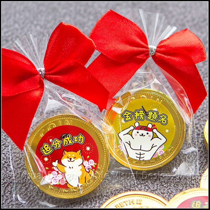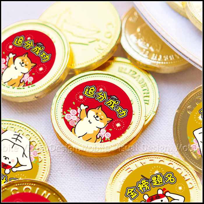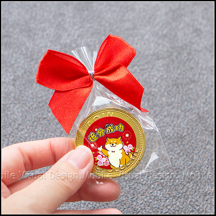 BlingBling的金幣造型巧克力, 上頭還貼有幸福朵朵獨家電繪設計3cm貼紙~ 有柴柴加持、有大肌肌熊熊助力! 吃起來口感滑順,濃濃巧克力香, 並繫上紅色蝴蝶結, 超級大方又活潑可愛唷✨