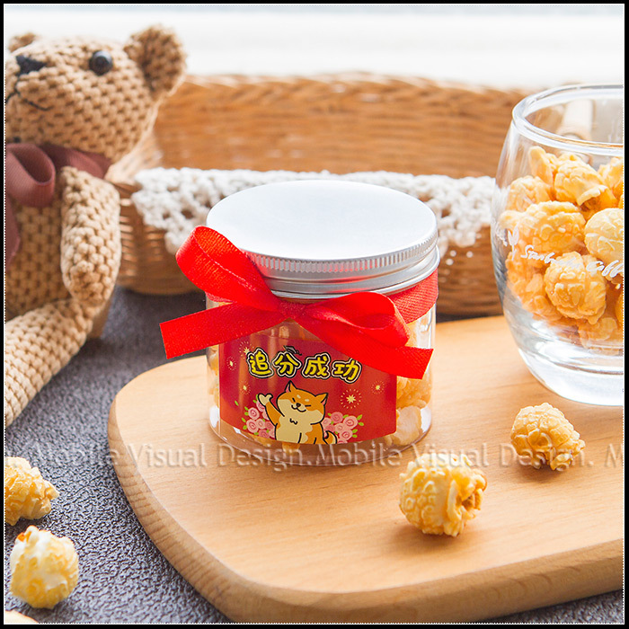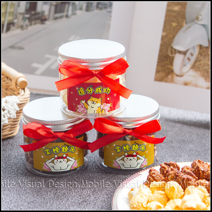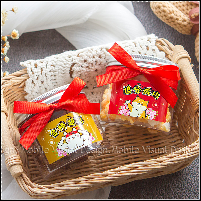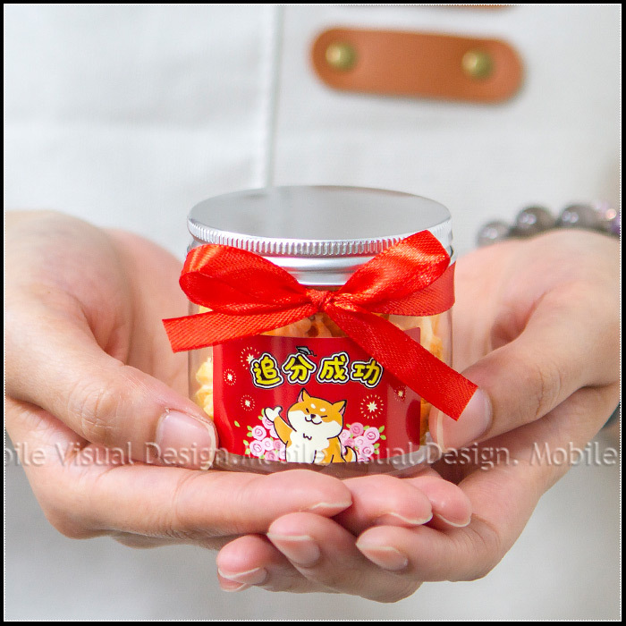每罐都貼有幸福朵朵獨家電繪插圖貼紙,有柴柴加持、有大肌肌熊熊助力!並繫上亮紅色緞帶,活潑又可愛唷✨拿來跟小朋友們分享超讚唷! 共有②款可挑:追分成功(柴柴款)、金榜題名(大肌肌熊熊款)