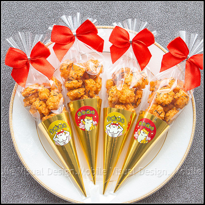 嘴饞嗎?來一片迷你海苔仙貝酥吧! 金黃色餅皮搭配海苔絲,酥酥脆脆卡滋卡滋超好吃😋 一口大小,方便入口又不會掉屑屑唷~~😍 絕對是聚會、下午茶、小朋友課後點心,最棒的選擇👍 每份都貼有幸福朵朵獨家電繪3cm插圖貼紙, 有柴柴加持、有大肌肌熊熊助力! 並繫上紅色蝴蝶結,活潑又可愛唷✨ 拿來跟小朋友們分享超讚唷! 共有②款可挑:追分成功(柴柴款)、金榜題名(大肌肌熊熊款)