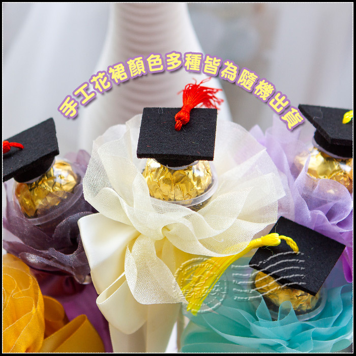 每支花棒均有金莎巧克力1顆入,花裙部分採手工製成! 並為您黏上畢業學士帽是一份可愛又甜美的禮物喔! 共2色可挑:紅色流蘇款(金莎1顆入)、黃色流蘇款(金莎1顆入) 適合畢業派對、幼稚園活動獎品、兒童獎品、園遊會、來店禮、禮贈品、candybar等活動都很適合,非常討喜喔😝 保存方式:避免高溫、潮濕及陽光曝曬處。 保存期限:至少半年以上。 產地:台灣