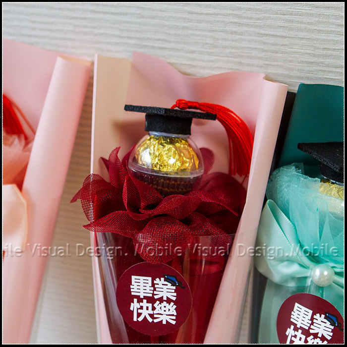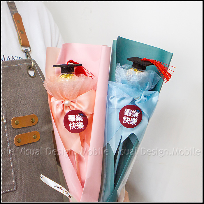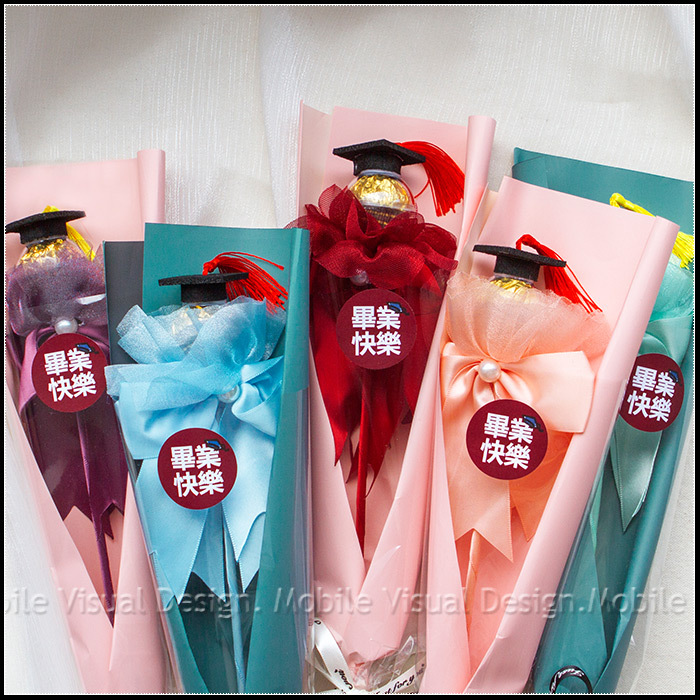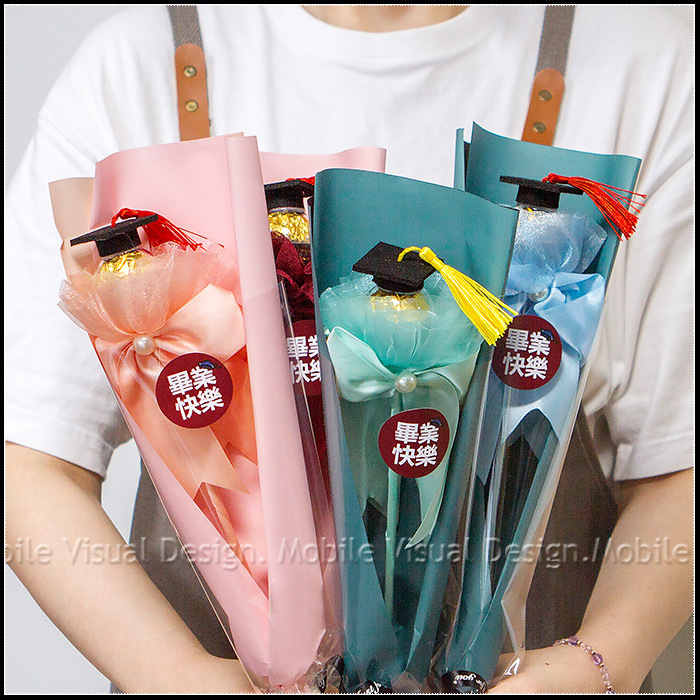每束均有1支超Q畢業帽金莎棒,並為您貼上4cm畢業快樂貼紙🩷 共5種規格可挑: 酒紅色金莎花棒+紅色流蘇款(金莎1顆入)、藕粉色金莎花棒+紅色流蘇款(金莎1顆入)、藍綠色金莎花棒+黃色流蘇款(金莎1顆入)、淺藍色金莎花棒+紅色流蘇款(金莎1顆入)、深紫色金莎花棒+黃色流蘇款(金莎1顆入) ※若遇紙材缺貨或斷貨,將以類同色他款替代。