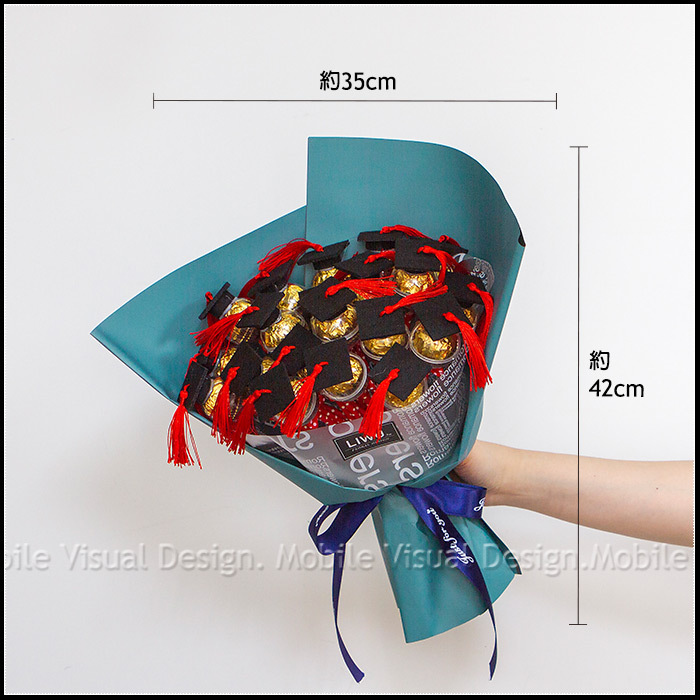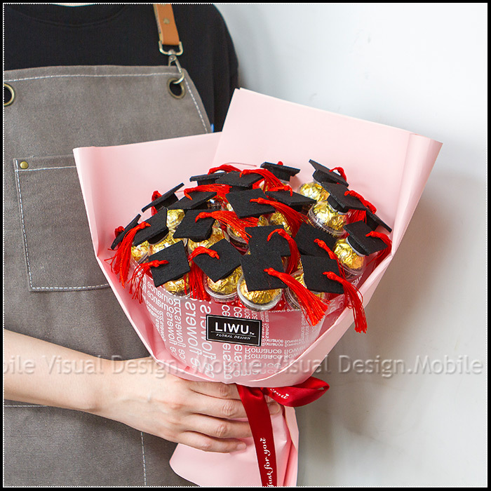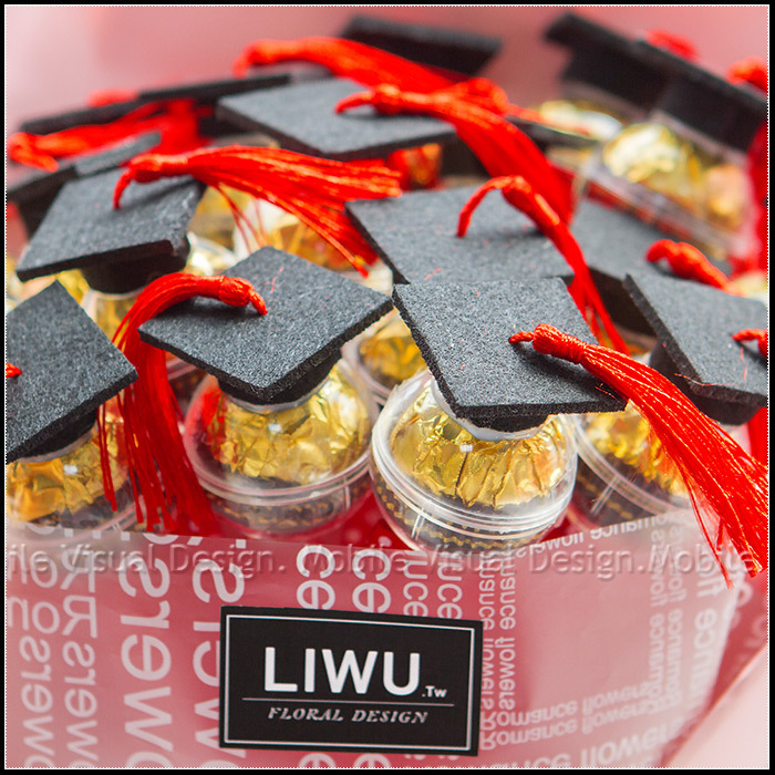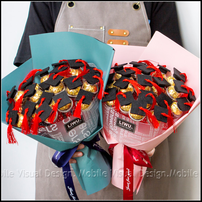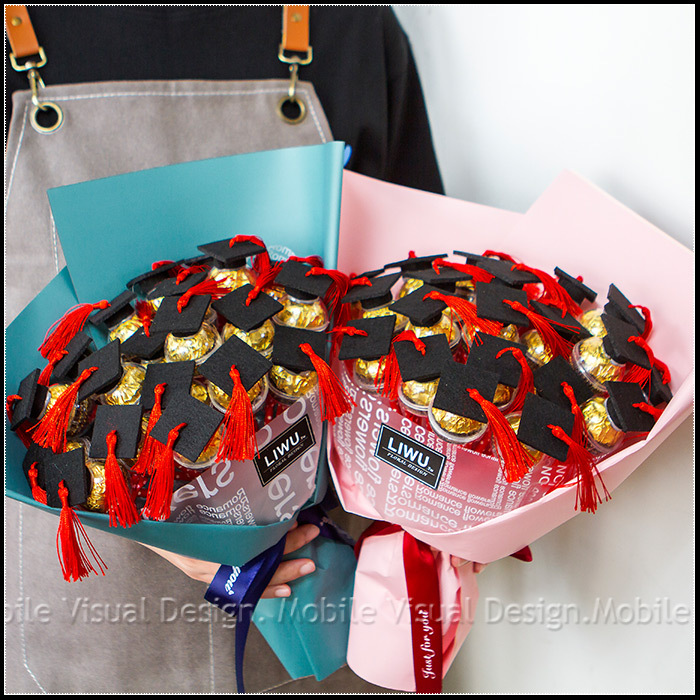 每束均有可愛逗趣的20支超Q畢業帽金莎棒 包裝紙顏色共有2色可挑:粉色、藍色