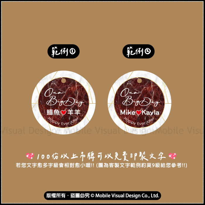 100份以下是公版吊牌(無客製文字) 100份以上吊牌可免費印製文字 *接單後,公版現貨約3天內交件,若是客製外標則約7-10天內交貨! ※訂購滿百份者若欲客製加印文字請詳閱以下注意事項↓↓↓ 1. 請務必記得要留言備註您的文字內容喔! 未備註者將以「公版」出貨 !!! 2. 若您文字愈多字級會相對愈小喔!! (圖8客製文字約莫9級給您參考!!) 保存方式:避免高溫、潮濕及陽光曝曬處。 保存期限:至少半年以上。 接單後排單交貨(趕件者請先詢問時間)