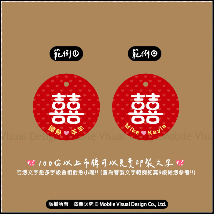 100份以下是公版吊牌(無客製文字) 100份以上吊牌可免費印製文字 *接單後,公版現貨約3天內交件,若是客製外標則約7-10天內交貨! ※訂購滿百份者若欲客製加印文字請詳閱以下注意事項↓↓↓ 1. 請務必記得要留言備註您的文字內容喔! 未備註者將以「公版」出貨 !!! 2. 若您文字愈多字級會相對愈小喔!! (圖9客製文字約莫9級給您參考!!) 保存方式:避免高溫、潮濕及陽光曝曬處。 保存期限:至少半年以上。 接單後排單交貨(趕件者請先詢問時間)