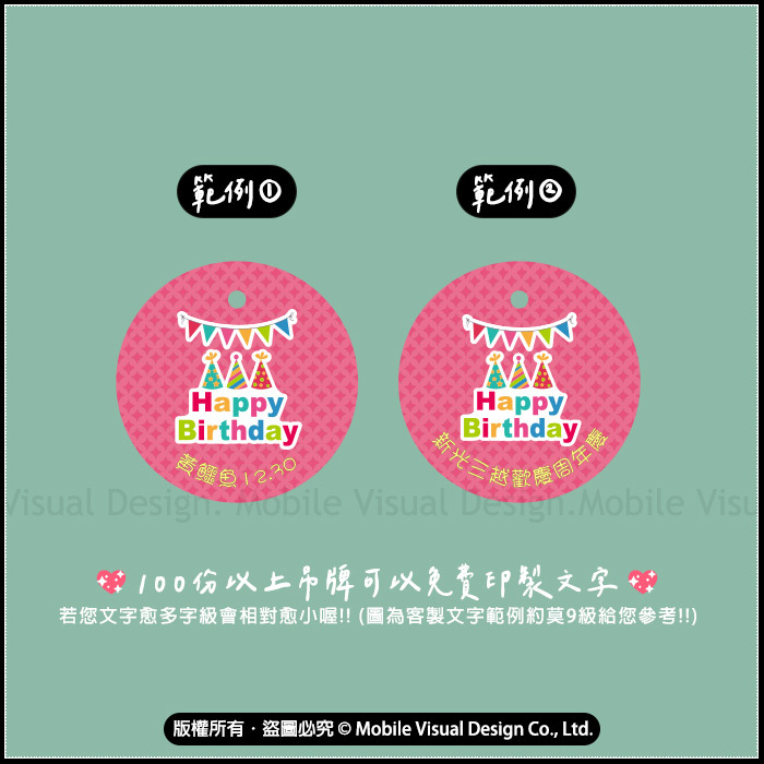 100份以下是公版吊牌(無客製文字) 100份以上吊牌可免費印製文字 *接單後,公版現貨約3天內交件,若是客製外標則約7-10天內交貨! ※訂購滿百份者若欲客製加印文字請詳閱以下注意事項↓↓↓ 1. 請務必記得要留言備註您的文字內容喔! 未備註者將以「公版」出貨 !!! 2. 若您文字愈多字級會相對愈小喔!! (圖9客製文字約莫9級給您參考!!) 保存方式:避免高溫、潮濕及陽光曝曬處。 保存期限:至少半年以上。 接單後排單交貨(趕件者請先詢問時間)