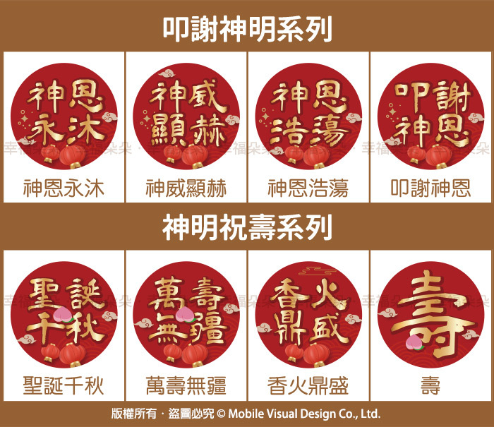 ●神明貼紙有多款可依需求挑選: ㊗Q版神明系列共55款可挑 ㊗叩謝神明系列共4款可挑 ㊗神明祝壽系列共4款可挑