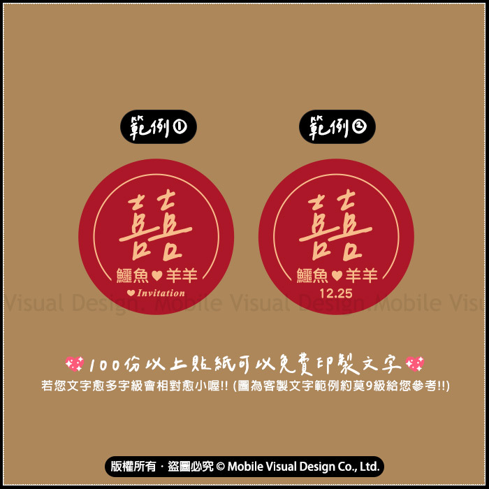 每份米香都貼有幸福朵朵獨家設計手寫風囍字貼紙,並為您繫上金色蝴蝶結,非常典雅可愛喔!拿來當作婚禮小物分送親友都很棒喔🧡 🧡100份以下是公版貼紙(無客製文字) 🧡100份以上貼紙可以免費印製文字 ※訂購滿百份者若欲客製加印文字請詳閱以下注意事項↓↓↓ 1. 請務必記得要留言備註您的文字內容喔! 未備註者將以「公版」出貨 !!! 2. 若您文字愈多字級會相對愈小喔!! (圖7客製文字約莫9級給您參考!!)
