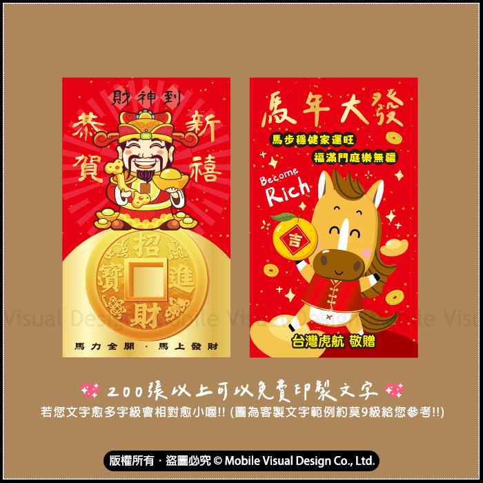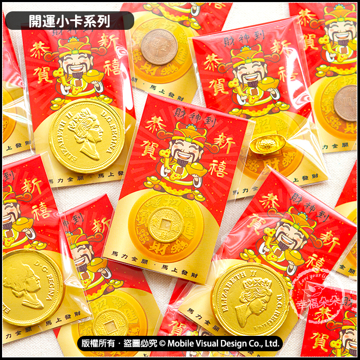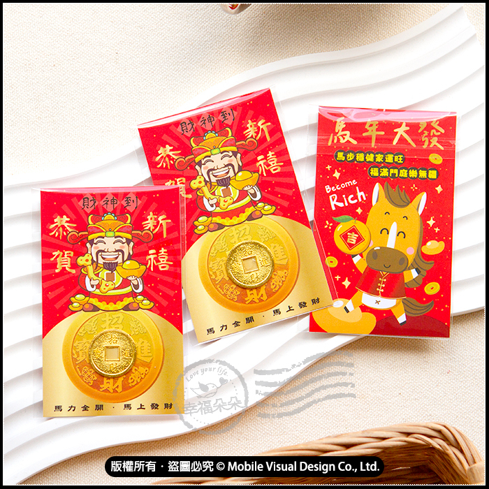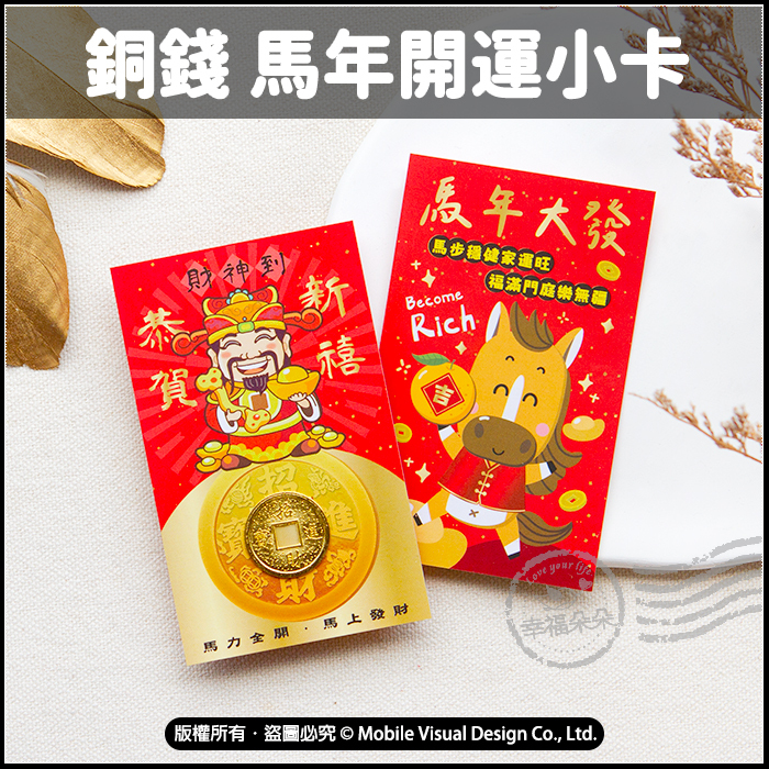由幸福朵朵獨家電繪設計💯✨ 創意插畫風格~~ 春節或開工、尾牙、婚禮必備!! 既可愛又活潑~~ 拿來當作錢母卡或招財開運小卡等等多用途超讚💙 非常喜氣✨✨✨ 一面是馬年大發,一面則是財神報喜, 兩面同時擁有,就是要讓您好運連連、發大財😘 每張皆貼有一個銅錢並附上opp袋包裝完成 可直接分送親友🥰