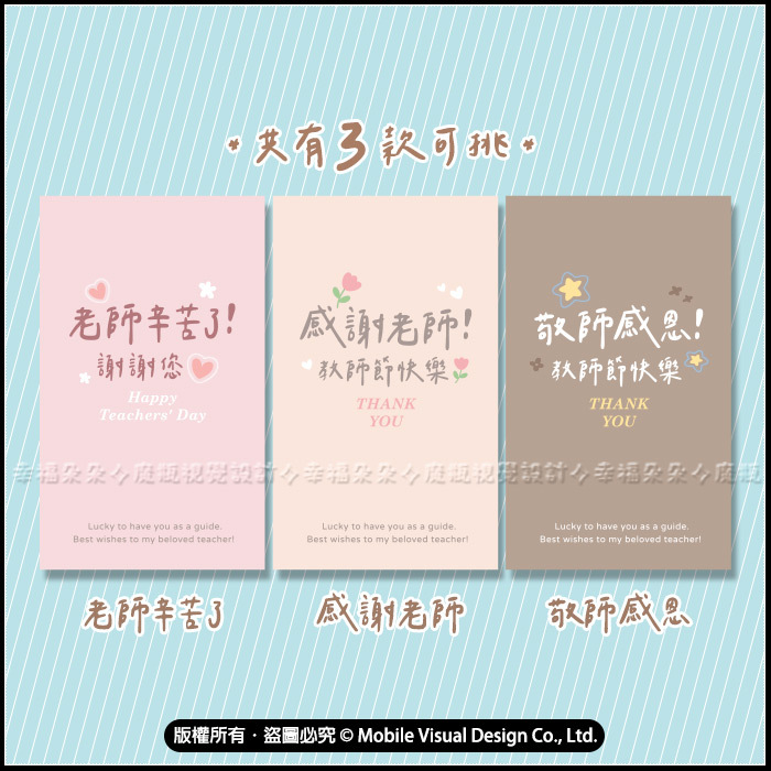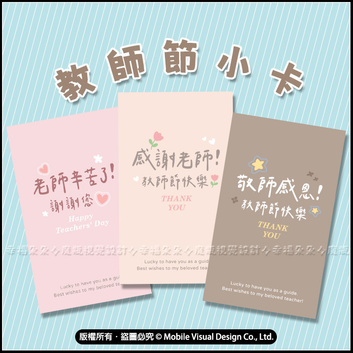 一年一度教師節又要來臨啦! 幸福朵朵團隊專為教師節設計了三種款式小卡~ 共有3款小卡可挑: 老師辛苦了、感謝老師、敬師感恩! 皆可依您需要的用途去做挑選唷~ 可像範例四一樣自行DIY加入小禮盒, 讓禮物更精緻~儀式感更到位💐