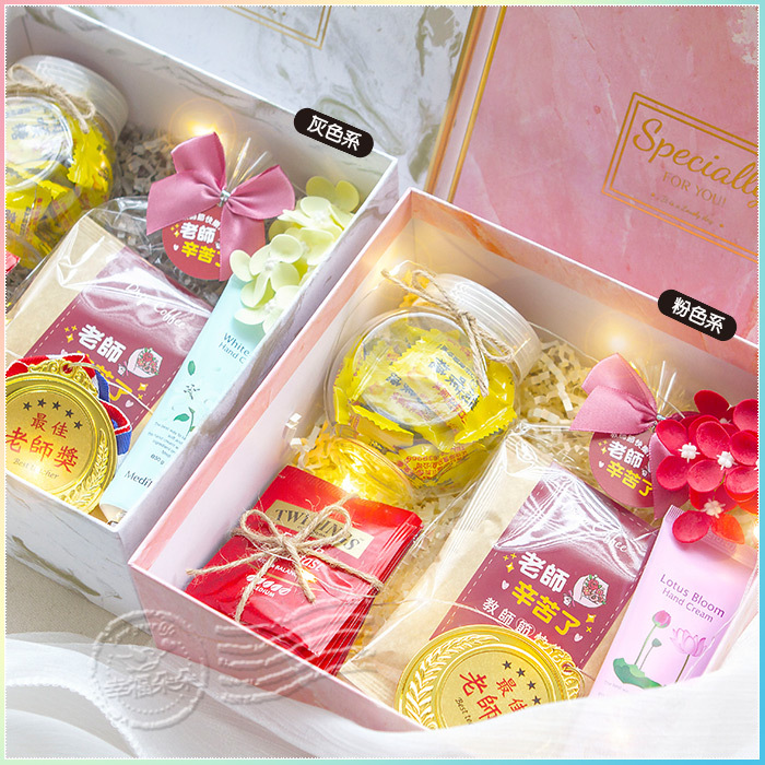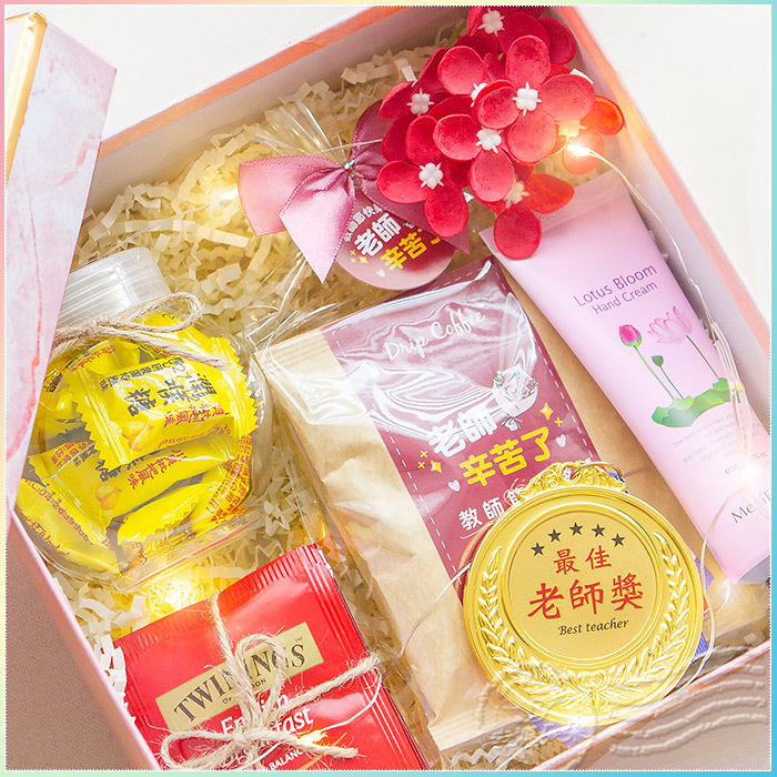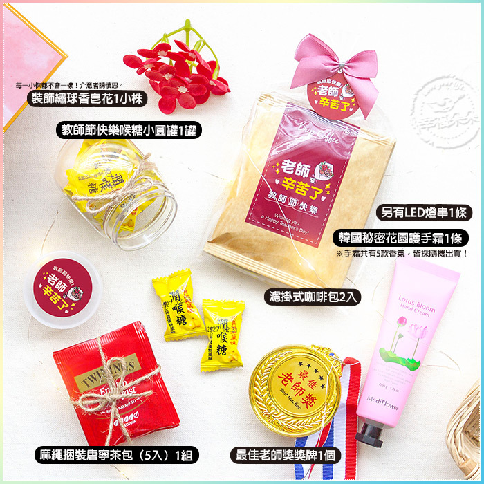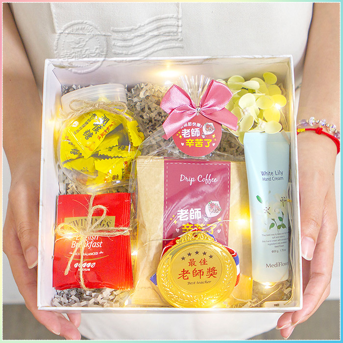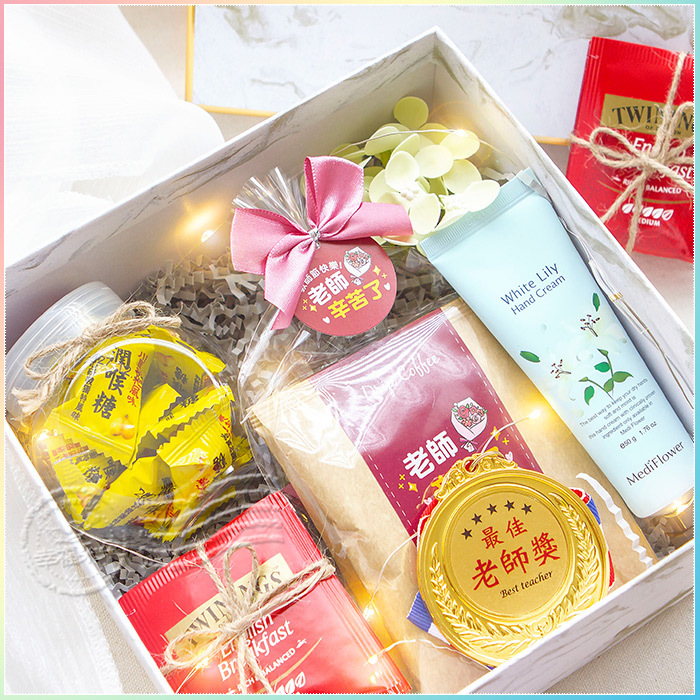 🎁 禮盒內容: 🍵 唐寧茶包 x5包:英倫經典,舒緩身心的片刻時光 🏆 最佳老師獎獎牌 x1:謝謝老師,是我們心中的No.1 🤲 護手霜 x1條:滋潤雙手,傳遞溫柔力量 🍬 喉糖 x1罐:保護嗓音,老師的必備小物 ☕ 教師節快樂濾掛咖啡 x2包:為您沖泡一杯專屬的感謝 💐 裝飾繡球香皂花X1:象徵感謝與祝福的香氛擺飾,永不凋謝的心意 ✨ LED燈串 x1:點亮心意,溫柔陪伴每個夜晚 🛍️ 附贈紙袋 x1:典雅包裝,送禮更有誠意