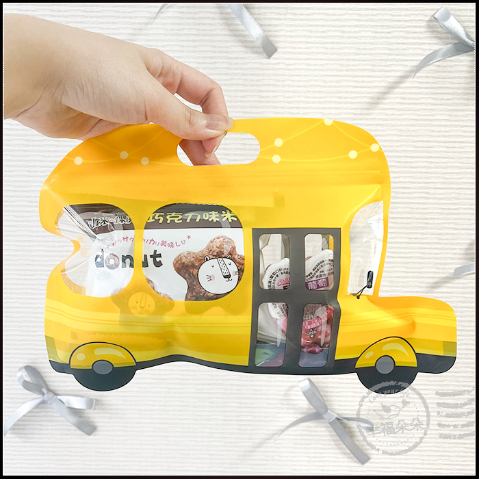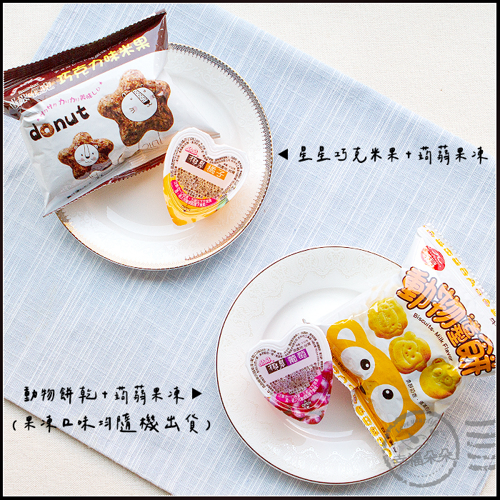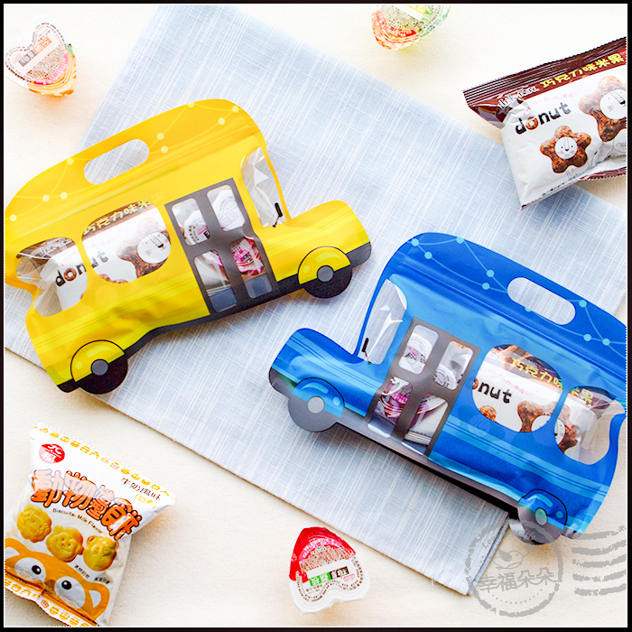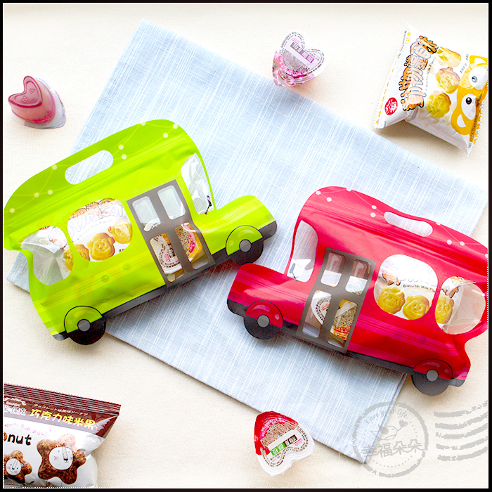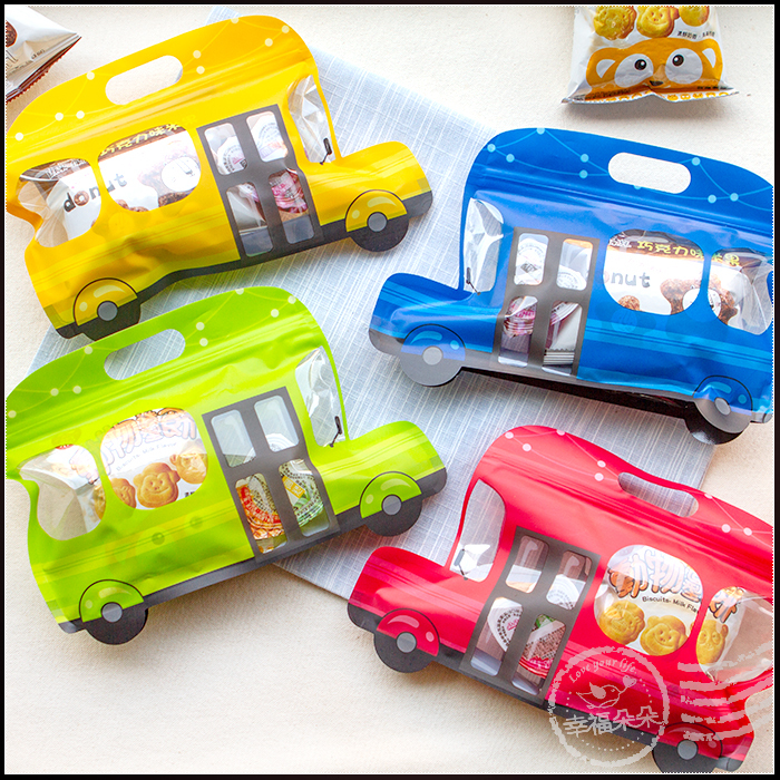 小汽車手提夾鏈袋 約26X18cm 動物餅乾含包裝 約11 x 13.5 cm (重約25g) 星星巧克米果含包裝 約寬13cmX高10.5cm (重約15g) 蒟蒻果凍含包裝 約長5.5 cm X 寬5.8 cm X 高3.5 cm (重約37g) (內容物手工測量,多少會有些微誤差喔! 不介意才下訂)