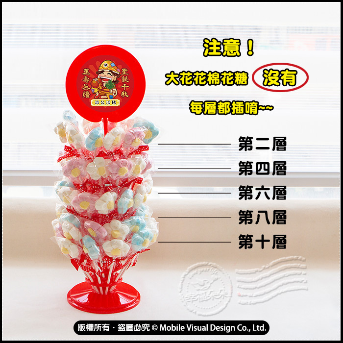 10層架子總高約50cm(重約221g) 台灣棒棒糖單支約直徑3cm圓x高8.7cm(13g) 小梅心棒棒糖單支約直徑3.3cm圓x高9cm(15g) 大花花棉花糖單支約4cmx高18~20cm(11g) (內容物手工測量,多少會有些微誤差喔! 不介意才下訂)
