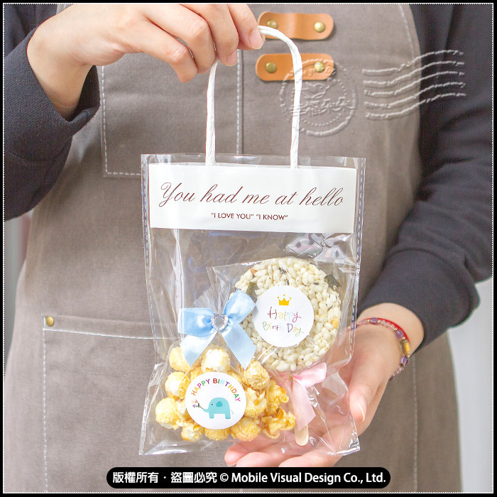 米香棒約 11 x 14cm 爆米花約9 x 10cm 透明提袋 約14.5 x 高30cm (含把手)(總重約47g) 內容物手工測量,多少會有些微誤差喔! 不介意才下訂