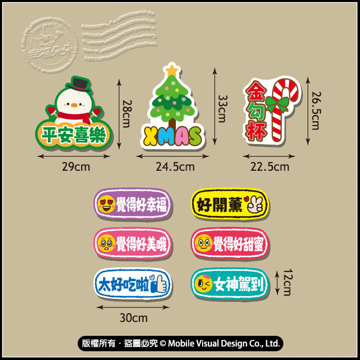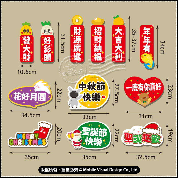 大吉大利10.6X37cm 年年有魚11X34cm 招財納福10.6X35cm 財源廣進10.6X37cm 好彩頭白蘿蔔10.5X31.5cm 發大財小鳳梨10.5X31.5cm 中秋節快樂太空兔33X27.5cm 花好月圓小白兔34.5X22cm 一鹿有你真好31X23cm 聖誕樹XMAS24.5X33cm 聖誕節快樂老公公35X22cm 平安喜樂小雪人29X28cm Christmas襪襪35X20cm 聖誕狂歡帽32.5X19cm 金勾杯拐杖糖22.5X26.5cm 覺得好幸福30X12cm 覺得好甜蜜30X12cm 覺得好美哦30X12cm 女神駕到30X12cm 好開薰30X12cm 太好吃啦30X12cm gg711 圓滿喜事繡球花40X16.5cm gg711 圓體囍字18X18cm g1054 生日快樂對話框29.5X15cm g1054 生日帽14X23cm g1514 鬍子&嘴唇手拿板14X16.5cm gg711 嫁好尪對話框30X12.5cm gg711 娶好某對話框30X12.5cm g3042 賺大錢紅包22X38cm g3598 金元寶37X22.5cm g1575 寬版雙喜字24X30cm g1575 窄版雙喜字15X30cm g1576 溫尪溫某27.5X14cm g2551 520數字24X29.5cm g1528 粗體&文字35X40cm g2639 愛心Mr.+Mrs.37X28cm g2668 給你愛心小讚手24X28cm g2668 給你讚讚小讚手20x30cm g2668 Cheers小讚手20x35cm g2668 送你花花小讚手21x34cm g1573 他很帥32X15.5cm g1573 她很美32X15.5cm g2669 手比愛心17.5X43cm g2670 NO.1獎盃25X37cm g2670 NO.2獎盃25X37cm g2670 NO.3獎盃25X37cm (內容物手工測量,多少會有些微誤差喔! 不介意才下訂)