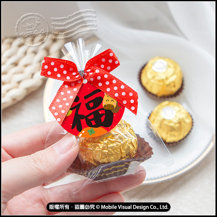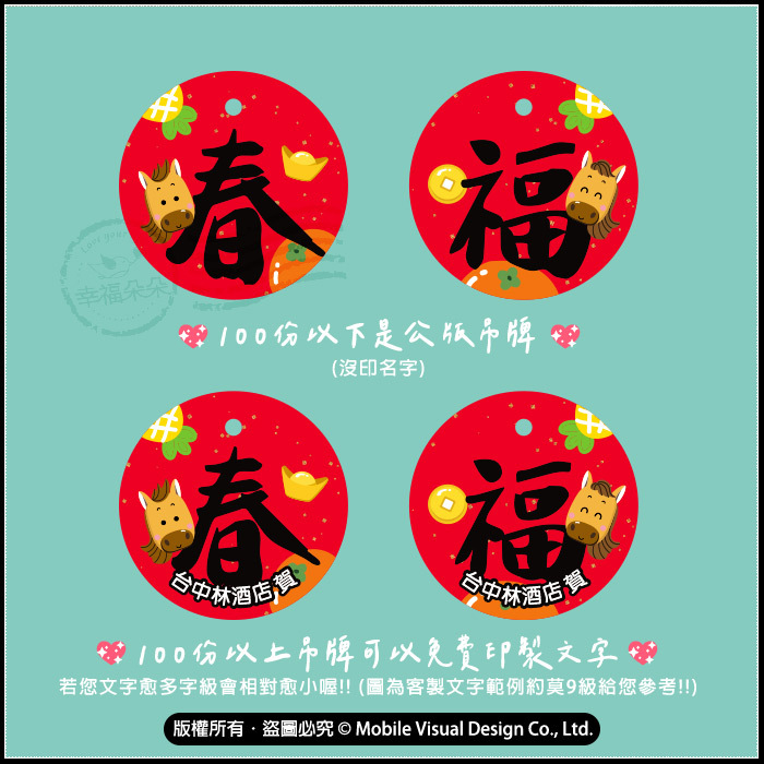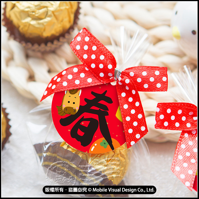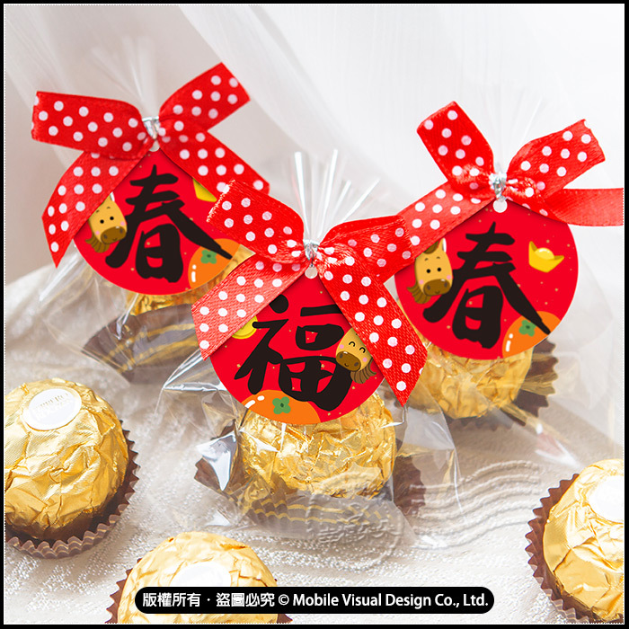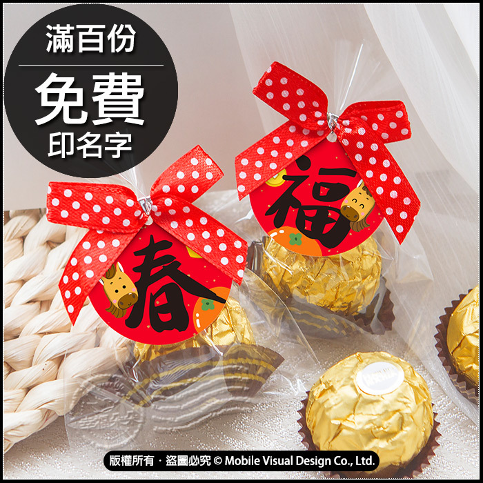 ✦ 馬年限定 -- 以喜氣紅色為主視覺,搭配水玉蝴蝶結與專屬馬年元素吊牌,象徵新的一年平安順遂、甜甜幸福。「春」「福」兩款吊牌各具寓意,讓送禮更有祝福感。 ✦ 滿百份免費印文字 專屬心意客製 -- 凡訂購滿100份即可免費加印文字或企業名稱,專屬訂製更具紀念價值。非常適合企業尾牙禮、學校活動小禮、婚宴回禮或節慶拜訪伴手禮。 ✦ 多款設計 彈性選擇 -- 提供「春字款」、「福字款」兩種可挑,皆採獨立包裝,衛生好保存。搭配節慶佈置或禮盒組合,展現滿滿春節氛圍。 ✦ 適用情境 -- 春節拜年伴手禮 年終尾牙小禮物 公司贈品、開工禮 派對分裝零食 新年交換禮物 親友祝福小物 *單筆訂購滿100份以上可挑1款於吊牌上免費加印客製文字! *單筆訂購滿200份以上可挑2款於吊牌上免費加印客製文字! *接單後,公版現貨約3天內交件,若是客製吊牌則約7-10天內交貨! ※訂購滿百份者若欲客製加印文字請詳閱以下注意事項↓↓↓ 1. 請務必記得要留言備註您的文字內容喔! 未備註者將以混2款「公版」出貨 !!! 2. 若您文字愈多字級會相對愈小喔!! (圖5客製文字約莫9級給您參考!!) 保存方式:存放於乾燥陰涼處即可 保存期限:至少半年以上