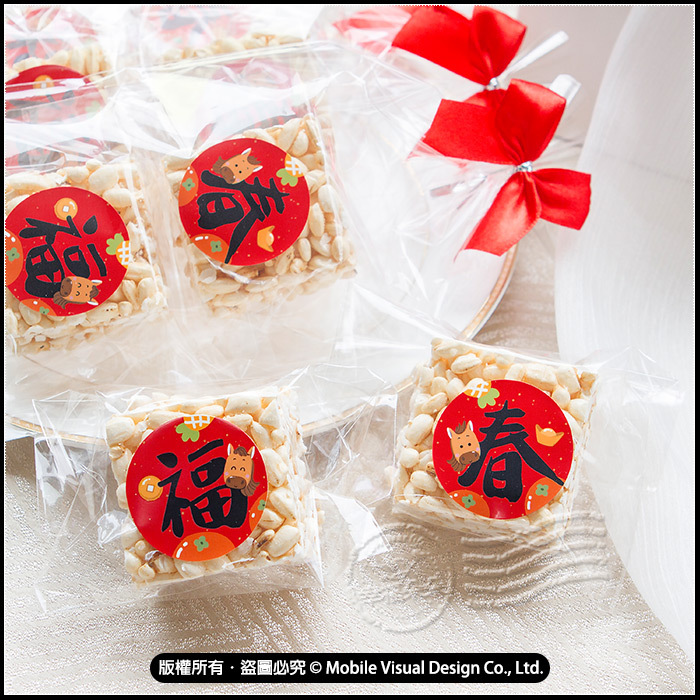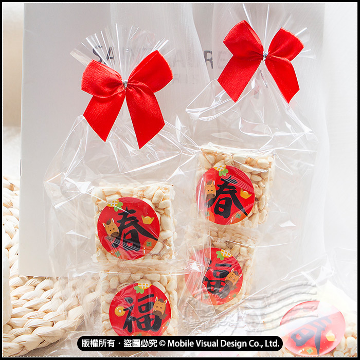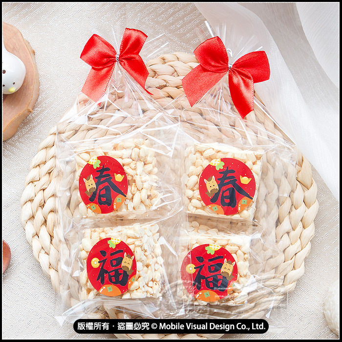 「春來福到米香2入」以純手工爆製的香脆米香搭配象徵好運的馬年元素春字與福字貼紙,創造濃濃年味。外層以透明OPP袋裝並綁上亮眼紅色蝴蝶結,不僅質感升級,更增添新春喜氣,是送禮與自用皆宜的節慶小點心。 💝 精緻造型,討喜不俗 透明袋包裝搭配紅色蝴蝶結,乾淨又俏皮,不僅可當活動小禮、節慶伴手禮,也適合婚宴回禮或客戶致贈。