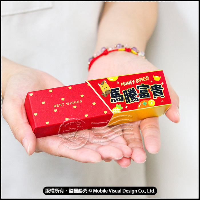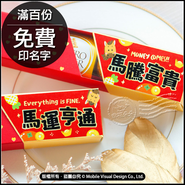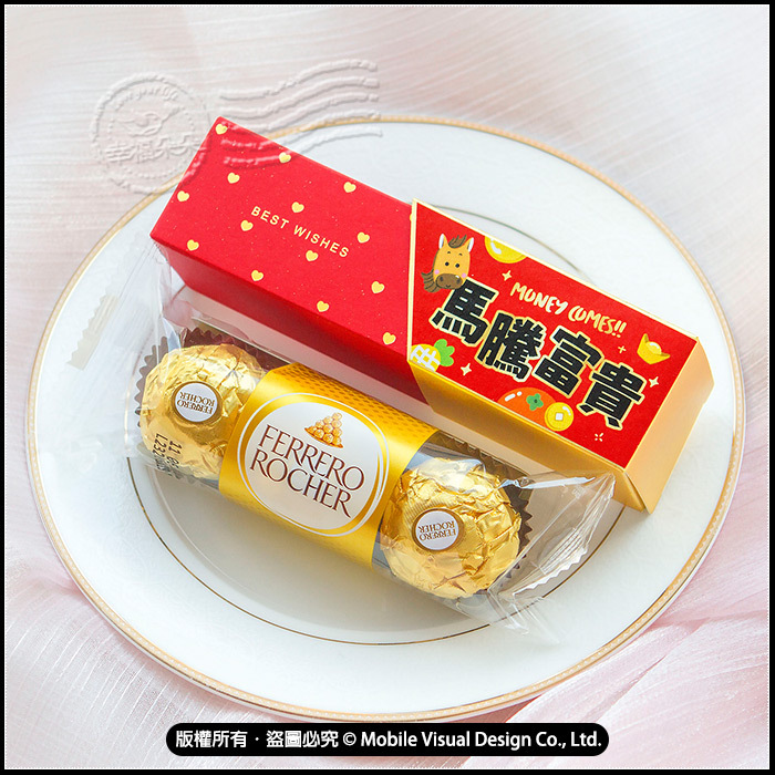 新年限定馬年款!以閃金紅盒設計搭配祝福語「馬騰富貴」「馬運亨通」,象徵好運與財富。內含3顆金莎巧克力,滿百份可免費印製文字或祝福小語,適合企業贈禮、婚禮回禮、節慶禮盒,甜蜜又吉祥! 馬年限定設計:以閃亮金紅配色呈現「馬騰富貴」、「馬運亨通」兩款祝福語,象徵萬事順利、財運亨通。 內含3顆Ferrero Rocher金莎巧克力,甜蜜香濃,外型高貴典雅。 高質感包裝:時尚紅金配色搭配小愛心圖案,精緻可愛又富喜氣氛圍。