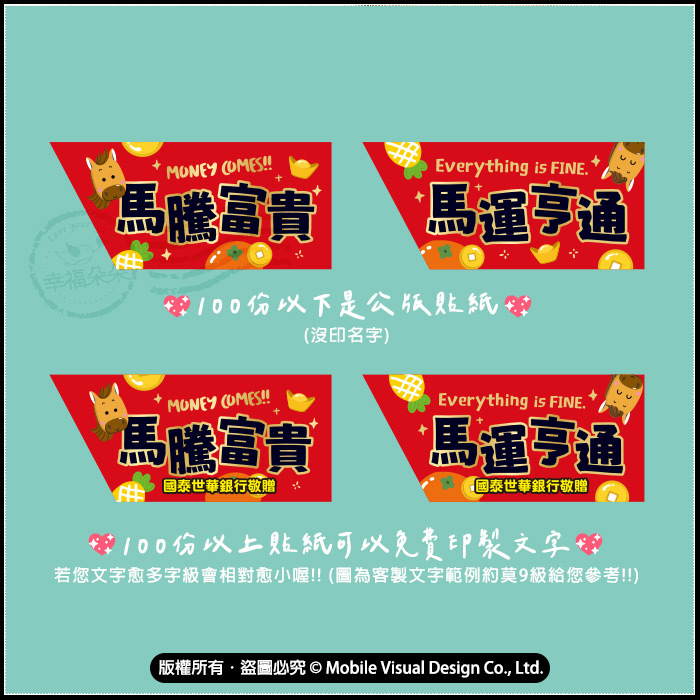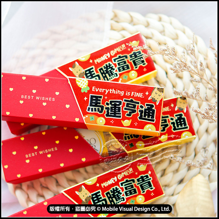 多場合適用:企業年節贈禮、婚禮回禮、尾牙活動、春節拜訪、開工好禮皆適合。 100份以下是公版貼紙(無客製文字) 100份以上可挑1款於貼紙免費印製文字 200份以上可挑2款於貼紙免費印製文字