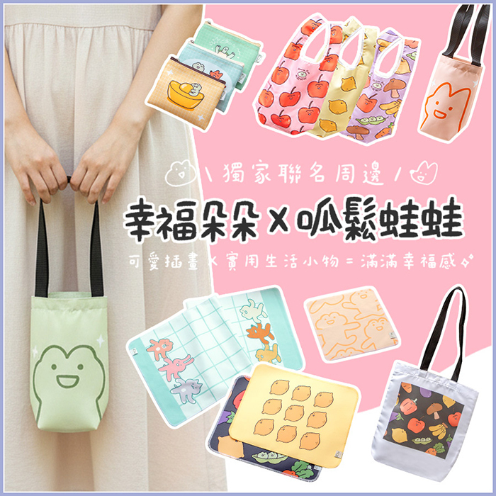 每一件商品都結合「插畫 × 實用設計」, 從飲料袋、毛巾、小方巾、餐墊到折疊袋, 讓呱鬆蛙蛙成為你生活的小夥伴, 在每個平凡的瞬間都能找到小小幸福。