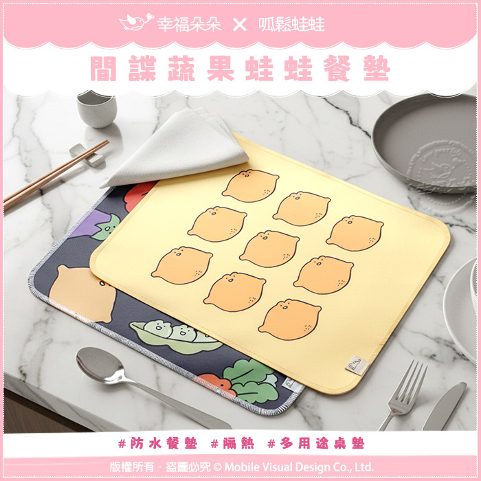 呱鬆蛙蛙最新作品-間諜蔬果蛙✨製成的餐墊有兩款可選:呱鬆檸檬蛙蛙、呱鬆蔬果蛙蛙。餐桌上有蛙蛙的陪伴真是太幸福了!!這系列的【幸福朵朵 × 呱鬆蛙蛙】獨家授權餐桌墊,採用環保材質布料,防水設計清潔便利,加厚四層圓邊不割手、雙面皆可使用,購入一款等於有兩款的使用感,超值實用,粉絲們買來收藏也很值得喔!