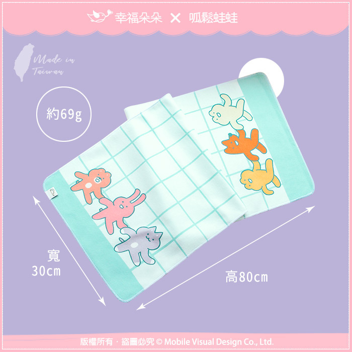 呱鬆蛙蛙的好朋友們全出動了!【幸福朵朵 × 呱鬆蛙蛙】獨家授權毛巾,可以看到所有小夥伴,每天陪你一起可可愛愛。此款毛巾為30X80cm大尺寸,薄度好擰,也可以當擦手巾喔!採用環保材質布料,真正MIT台灣精製,觸感極佳,超值好用。限量款,請把握機會喔!