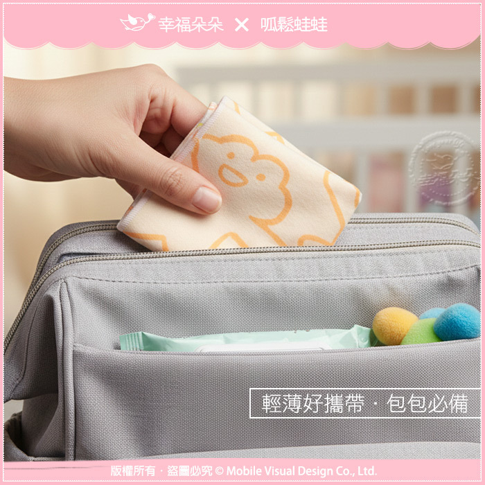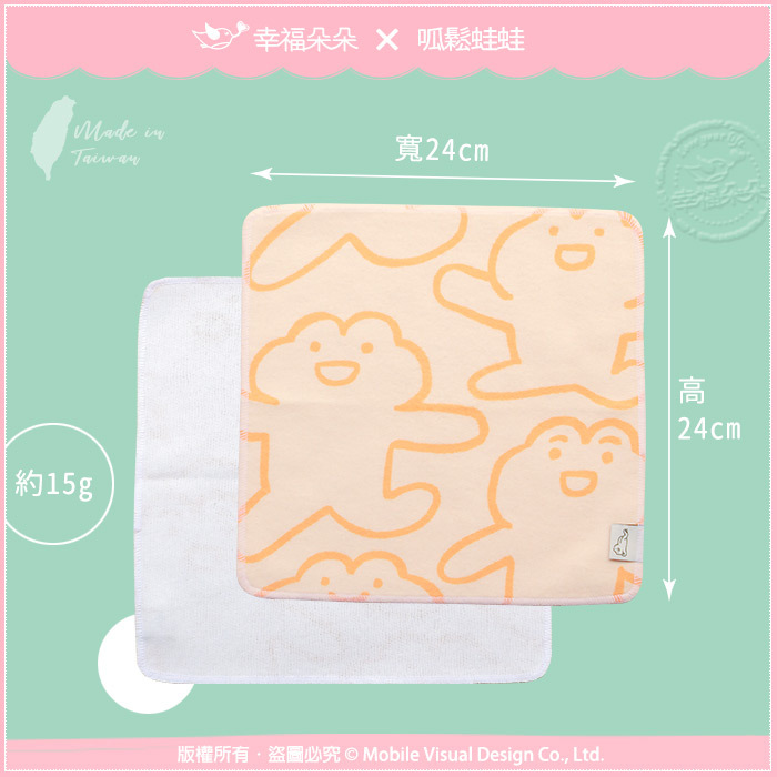 【幸福朵朵 × 呱鬆蛙蛙】獨家授權小方巾,是招牌呱鬆蛙蛙圖案喔!24x24cm大小適中,是兒童毛巾首選,採用環保材質布料,真正MIT台灣精製,觸感極佳,薄度好擰,也可當作小手帕隨身攜帶喔!