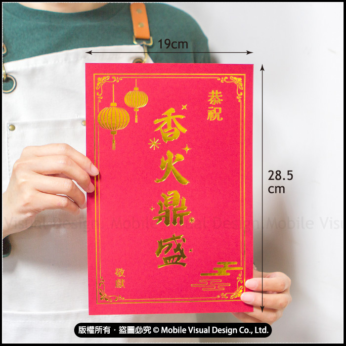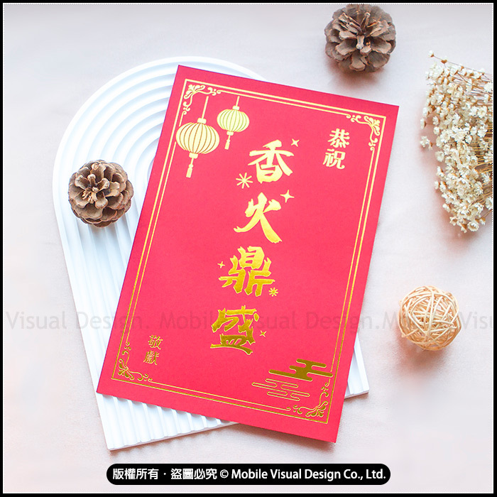 誠心祝壽必備!本款【燙金祝壽拜帖 敬獻卡】採用高質感紅卡紙搭配燙金字樣設計,字體立體閃耀,象徵吉祥富貴與誠意滿滿。 適用於神明祝壽、聖誕千秋、佛誕法會、開光典禮、廟宇慶典、祝賀法會等場合,可搭配花籃、供品、香案使用,傳達誠心敬意與祝福心意。 特色 --- ✔燙金工藝,質感典雅莊重 ✔祝賀詞可選:「恭祝聖誕千秋」、「恭祝香火鼎盛」 ✔紅色喜氣設計,象徵福氣與祝壽誠心 ✔適用各式神明祝賀、壽誕慶典場合 ✔兩種尺寸,可作為花卡、插牌或賀卡使用 小張的適用在小型供品,可直接粘貼使用,大張的適用在大型供品做插牌使用喔!不同尺寸滿足您不同需求! 適用對象 --- 媽祖、關聖帝君、土地公、觀音佛祖、王爺、三太子…等神明壽誕與祝賀場合皆適用。 款式2款可選:恭祝聖誕千秋、恭祝香火鼎盛 基本訂量:10張起訂(可混合款式及尺寸) 【為什麼選擇我們?】 我們的祝壽拜帖卡採用高品質燙金工藝,字體立體清晰,呈現莊嚴與喜氣兼具的視覺效果。不論是家庭供奉、宮廟祝壽、或大型慶典使用,都能展現誠心與敬意。 ♥︎若大量訂購下訂前務必先詢問庫存數是否足夠喔!