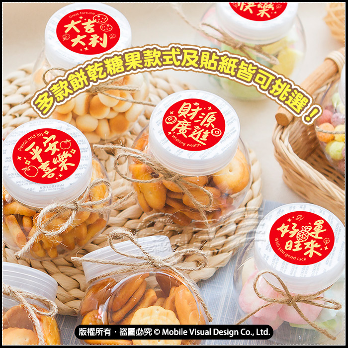 過年就是要吃得開心、送得有面子! 這款【新年喜氣4字版 餅乾小圓罐】結合可愛造型、豐富內容與滿滿祝福,是年節送禮首選✨ ✈ 飛機造型餅乾72g 🔢 數字造型餅乾80g 🍪 小奇福圓型餅乾80g 🌈 五彩球餅乾51g 🍘 小饅頭74g 🌸 小花棉花糖61g 🧸 小熊棉花糖61g ❤️ 愛心棉花糖61g 並提供多款4cm新年喜氣4字版貼紙可挑選 1️⃣ 恭喜發財 2️⃣ 新春快樂 3️⃣ 大吉大利 4️⃣ 好運旺來 5️⃣ 財源廣進 6️⃣ 平安喜樂 (下單請備註款式,未備註將隨機出貨) ✨商品特色 -- ✔ 透明小圓罐設計,內容一目了然 ✔ 內含5種人氣零食,一次滿足 ✔ 6款新年祝福貼紙可任選 ✔ 適合拜年、送親友、公司送禮、活動贈品 ✔ 喜氣滿滿,拍照好看又好吃 ✨適合場合 -- ・過年拜年 ・春節送禮 ・公司發糖發餅 ・客戶伴手禮 ・開市賀禮 ・活動小禮物 ・年節佈置拍照 請常溫保存乾燥陰涼處,避免高溫、潮濕及陽光曝曬處。 期限:未開封至少180天以上 ♥︎若大量訂購下訂前務必先詢問庫存數是否足夠喔!