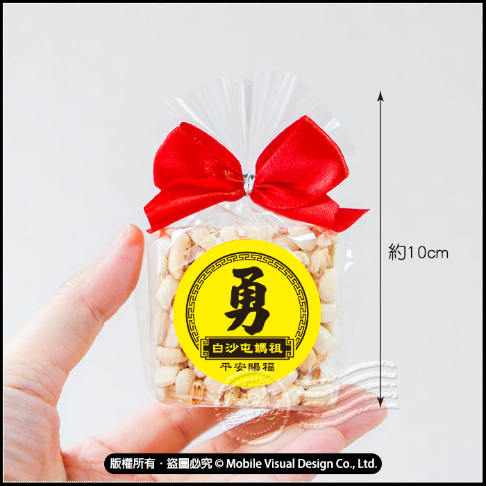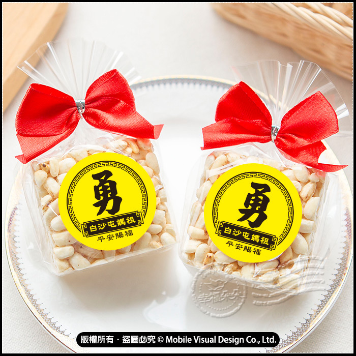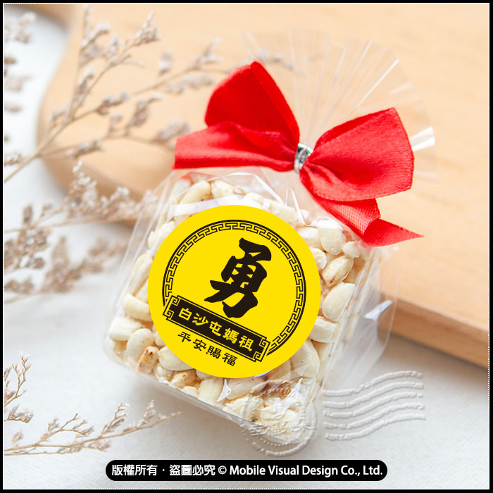 白沙屯媽祖進香必備,此款「勇」字方形米香象徵勇氣加持與平安圓滿。 嚴選優質台灣米製作,口感酥脆不黏牙。 單片獨立包裝設計,好拿不沾手,是香燈腳補充體力的最佳結緣小物。 媽祖加持意象: 包裝印有經典「勇」字與「平安賜福」字樣,象徵跟隨粉紅超跑的勇腳精神,傳遞深層的平安與祝福。 美味補給: 脆口不黏牙,老少咸宜,全素者亦可安心食用。 衛生便攜: 採用單片獨立方形包裝與精美蝴蝶結裝飾,方便在進香路途中隨時分享結緣或作為補給能量點心。 多用途場景: 除了作為進香結緣品,也適合廟會祝壽、公司團拜、婚禮小物或日常平安禮。