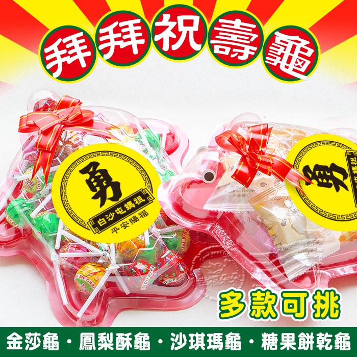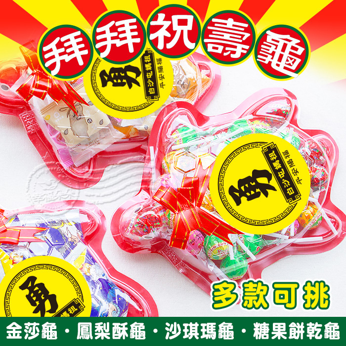小祝壽龜(含金莎巧克力X12顆)---320元 小祝壽龜(含科學麵mini包X10包)---160元 小祝壽龜(含漢堡軟糖X20顆)---200元 小祝壽龜(含七七乳加巧克力X50顆)---350元 小祝壽龜(含蒟蒻果凍X10顆)---150元 小祝壽龜(含沙士糖X60顆)---160元 小祝壽龜(含台灣小麻糬X10個)---200元 小祝壽龜(含鳳梨酥X8個)---196元 小祝壽龜(含金鑽糖X40顆)---180元 小祝壽龜(含乖乖軟糖X50顆)---250元 小祝壽龜(含菜脯餅X5包)---140元 小祝壽龜(含草莓夾心棉花糖X20顆)---160元 小祝壽龜(含花生酥糖X30顆)---250元 小祝壽龜(含象皮糖X15片+柑仔糖X10顆)---210元 小祝壽龜(含小煎餅X20個)---200元 小祝壽龜(含沙琪瑪X6個+草莓夾心糖X8顆)---160元 小祝壽龜(含馬卡龍夾心餅X30個)---160元 小祝壽龜(含雪Q餅X10個+乖乖軟糖X20顆)---260元 小祝壽龜(含德國小熊軟糖X30小包)---280元 小祝壽龜(含森永牛奶糖X50顆)---150元 小祝壽龜(含小梅心棒棒糖X20支)---300元 小祝壽龜(含台灣水果棒棒糖X40支)---300元 小祝壽龜(含黑糖麥芽餅X20顆)---160元 小祝壽龜(含川貝枇杷糖X50顆)---200元 小祝壽龜(含足球巧克力X150顆)---400元 小祝壽龜(含益生菌軟糖X40小包)---220元 小祝壽龜(含迷你甜筒棉花糖X12個)---245元 小祝壽龜(含偉特糖X50顆)---250元 小祝壽龜(含馬來西亞水果軟糖X40顆)---220元 小祝壽龜(含迷你曼陀珠X50條)---400元 小祝壽龜(含柑仔糖X40顆)---180元 小祝壽龜(含迷你平安米X20小包)---260元 小祝壽龜(含桃酥X15個)---175元
