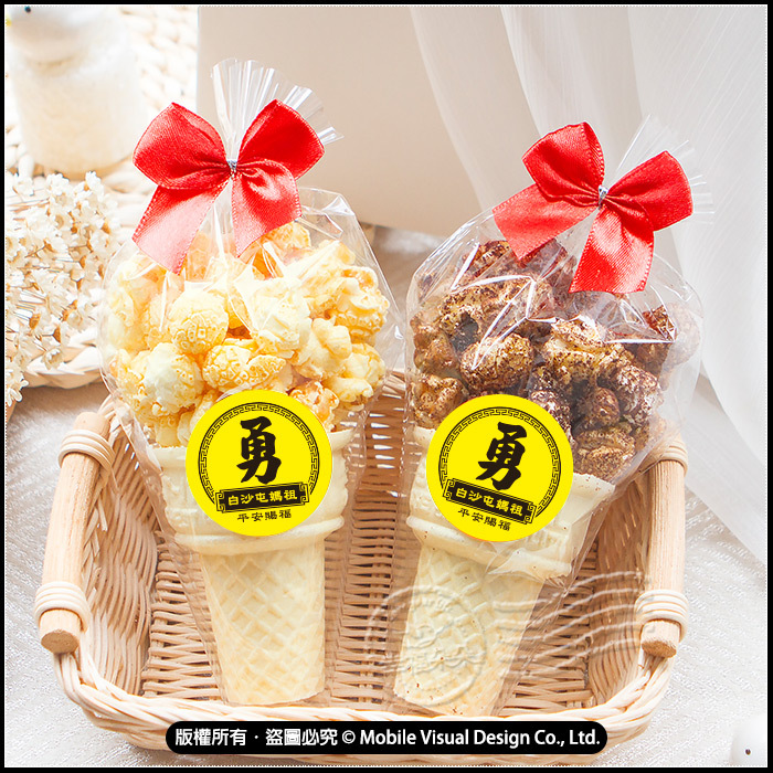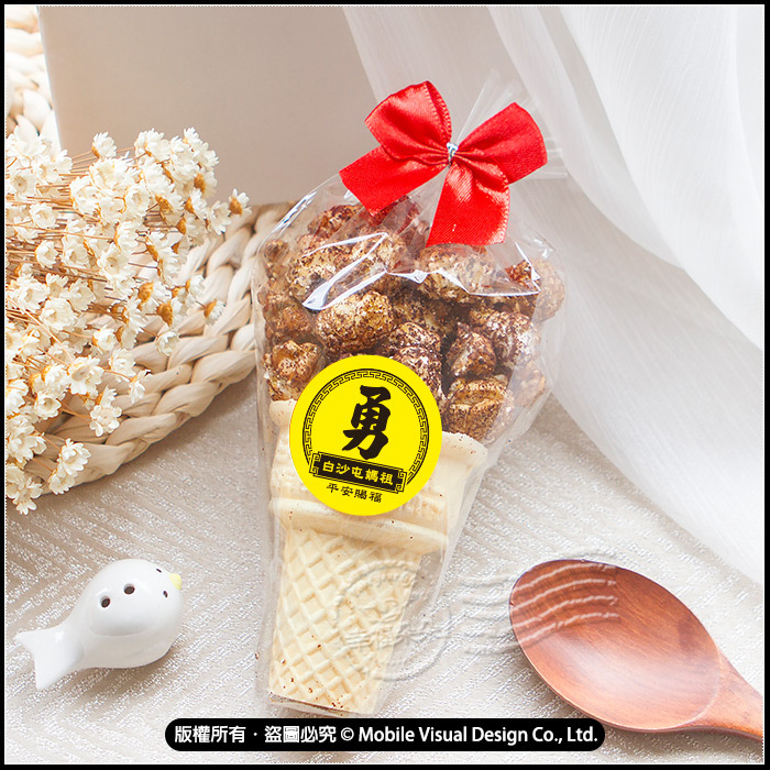 傳承信仰精神,將媽祖的平安守護化作一份精緻小禮。獨特的「勇」字圓標與討喜的紅色蝴蝶結設計,讓這份結緣品在眾多拜拜物資中脫穎而出。 .文化文創結合: 官方風格「勇」字貼紙,象徵平安與勇敢,最適合進香分送。 .口感極佳: 嚴選高品質爆米花,口味香濃酥脆。 .精緻包裝: 手工繫上紅色緞帶蝴蝶結,體面大方,即開即食。 .視覺吸睛: 獨特甜筒造型,無論是擺在神桌祭祀或作為婚禮小物都非常討喜。 .客製預訂: 依據您的進香日期新鮮製作,不怕久放受潮。 🧡需提前3周以上預訂,請先留言使用日期及數量,確認後再下訂,謝謝您!! 採接單後新鮮現做於使用日期前2-3天交貨(趕件者請先詢問時間)