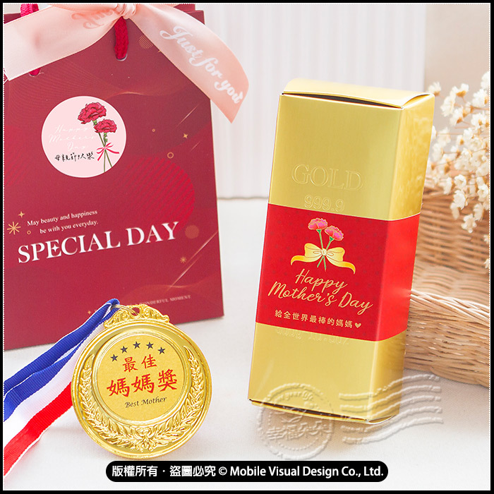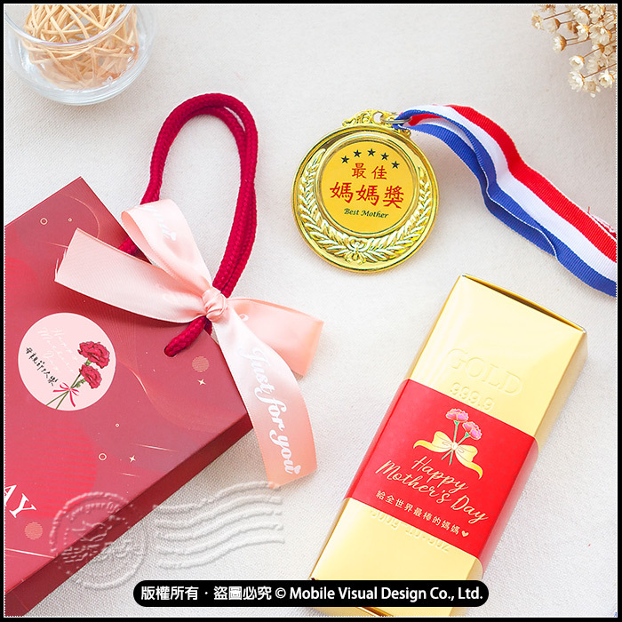 這不僅是一份禮物,更是一份感動與尊榮!我們將象徵好運的金磚米與充滿榮譽感的獎牌完美結合,透過明亮、質感的日系雜誌風配色,為媽媽打造一份既實用又具紀念意義的驚喜。 🏅 最佳媽媽獎牌: 亮眼質感,附上三色掛帶,讓媽媽戴上瞬間成為全家焦點,拍照打卡超吸睛! 🌾 招財金磚米: 精選好米包裝成金磚外型,寓意衣食無憂、財源滾滾,是最貼心的實用派選擇。 🎀 高質感禮袋組合: 漸層酒紅「Special Day」提袋搭配粉嫩絲滑緞帶,充滿 Lifestyle 居家生活儀式感。 ✨【禮包內容】: • g2213母親節金磚米X1個 • g1338最佳媽媽獎獎牌X1個 • g4041紅色SPECIAL DAY手提小紙袋X1個(已貼4cm母親節快樂貼紙,需自行裝入) • 44cm香檳粉色緞帶X1條(需DIY綁上) ♥︎若大量訂購下訂前務必先詢問庫存數是否足夠喔!