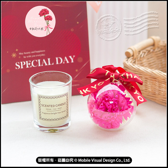 ✨ 拾光香氛蠟燭: 簡約透明玻璃杯設計,散發輕柔療癒香氣,為居家空間增添儀式感。 ✨ 康乃馨花球吊飾: 象徵愛的康乃馨,被溫柔包裹在透明球中,搭配「Thank You」紅色緞帶,精緻迷人。 ✨ 質感滿分包裝:附贈紅色系喜慶提袋與「THANK YOU」香檳燙金緞帶,從內到外展現十足誠意。 ✨ 多用途首選:除了母親節送禮,也適合公司福委會活動、社區小禮品。 ✨【禮包內容】: • g3816拾光杯香氛蠟燭(英國梨與小蒼蘭)X1個 • g4153母親節康乃馨花球吊飾(玫紅色)X1個 • g4041紅色SPECIAL DAY手提小紙袋X1個(已貼4cm母親節快樂貼紙,需自行裝入) • 44cm香檳粉色緞帶X1條(需DIY綁上) ♥︎若大量訂購下訂前務必先詢問庫存數是否足夠喔!