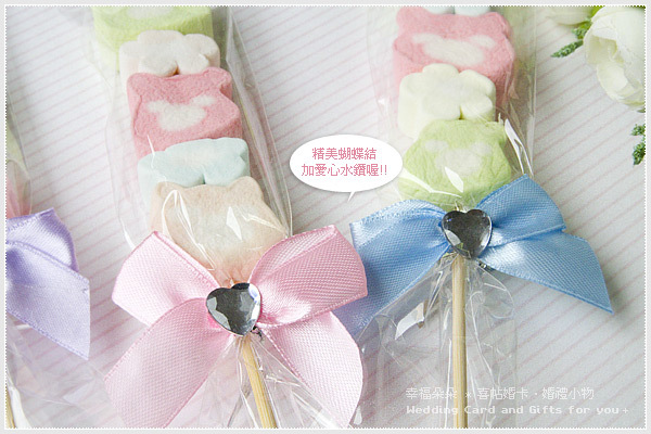 *棉花糖串是近期流行的二次進場送客禮,亦可當做送客時的喜糖喔~ *我們的小熊花園棉花糖是由兩種顏色做間隔串起的喔,蝴蝶結更是不計成本裝飾一顆bling bling的愛心水鑽,真是美呆了^_^ *棉花糖講究衛生安全,全程採用乳膠手套+口罩製作,並使用熱封封口機連同竹籤整支封起,竹籤更是台灣竹山的桂竹生產~外銷用優良品質喔。