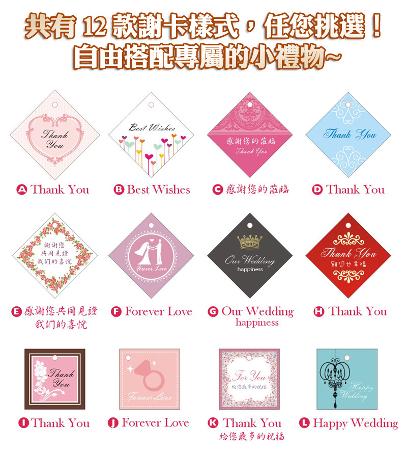 *加購小卡每份另+3元!小謝卡共有12款樣式可以挑選,指定小謝卡樣式記得留言備註款式喔!未指定者一律以H款「Thank You 願您也幸福」幫您綁好出貨!