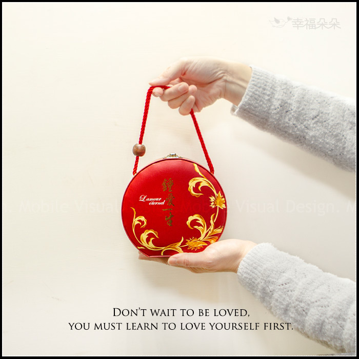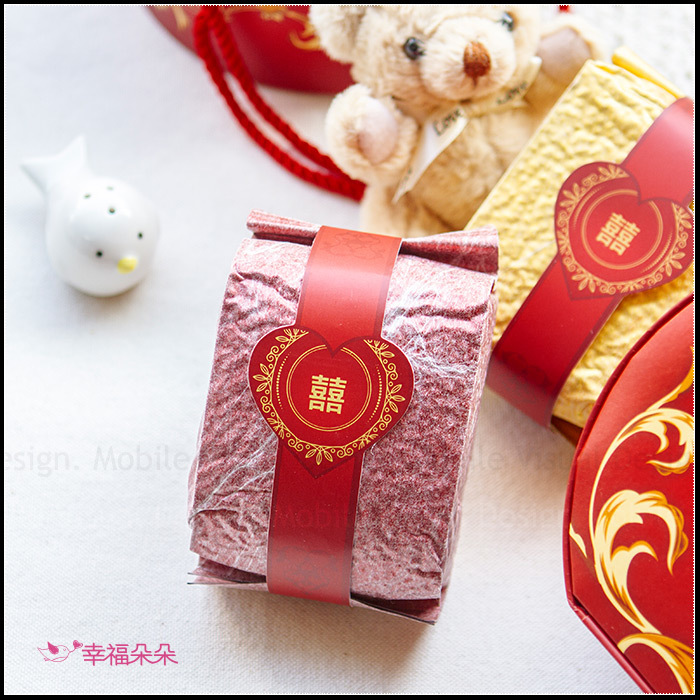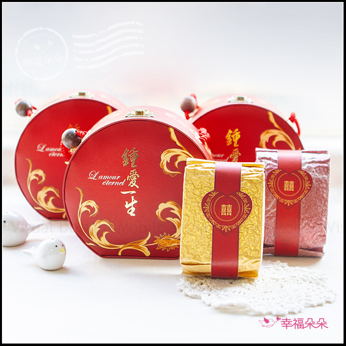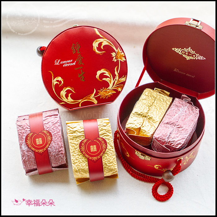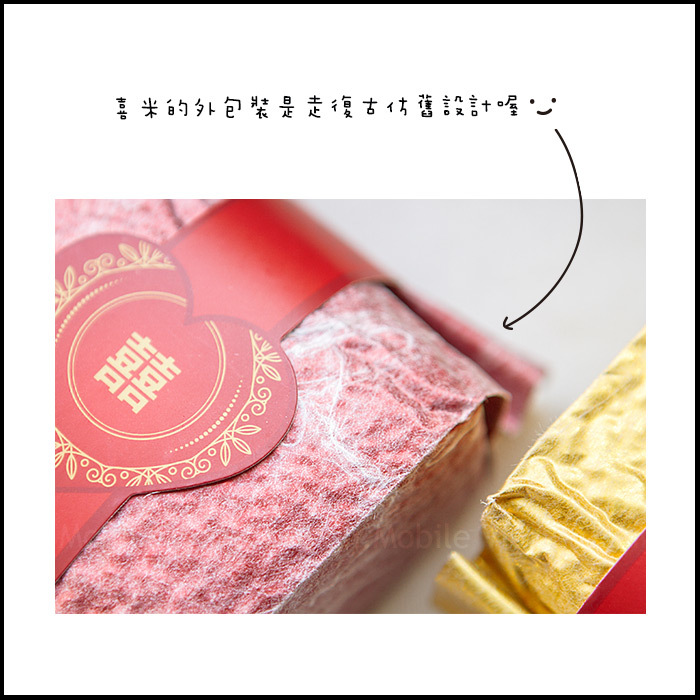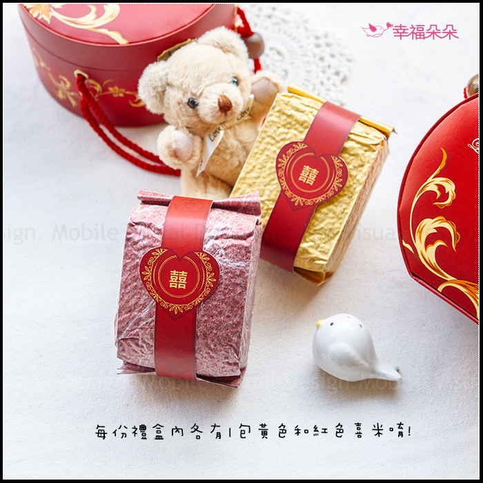 *此款喜米以大紅色「手提包」的造型做包裝,攜帶方便,外包裝印有「鍾愛一生」的文字,並以金色的花紋做裝飾,相當喜氣。用畢手提包還可以當珠寶盒、置物盒使用呢!好處多多~~