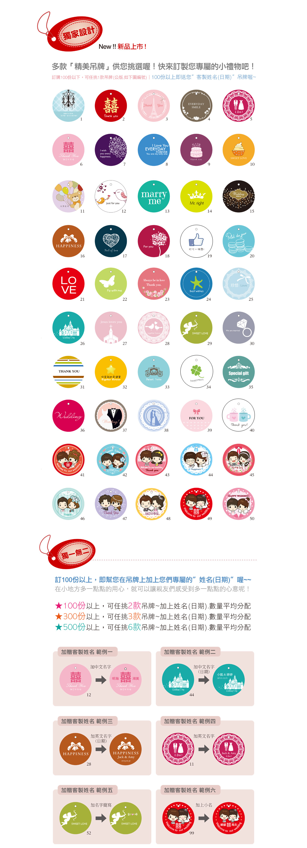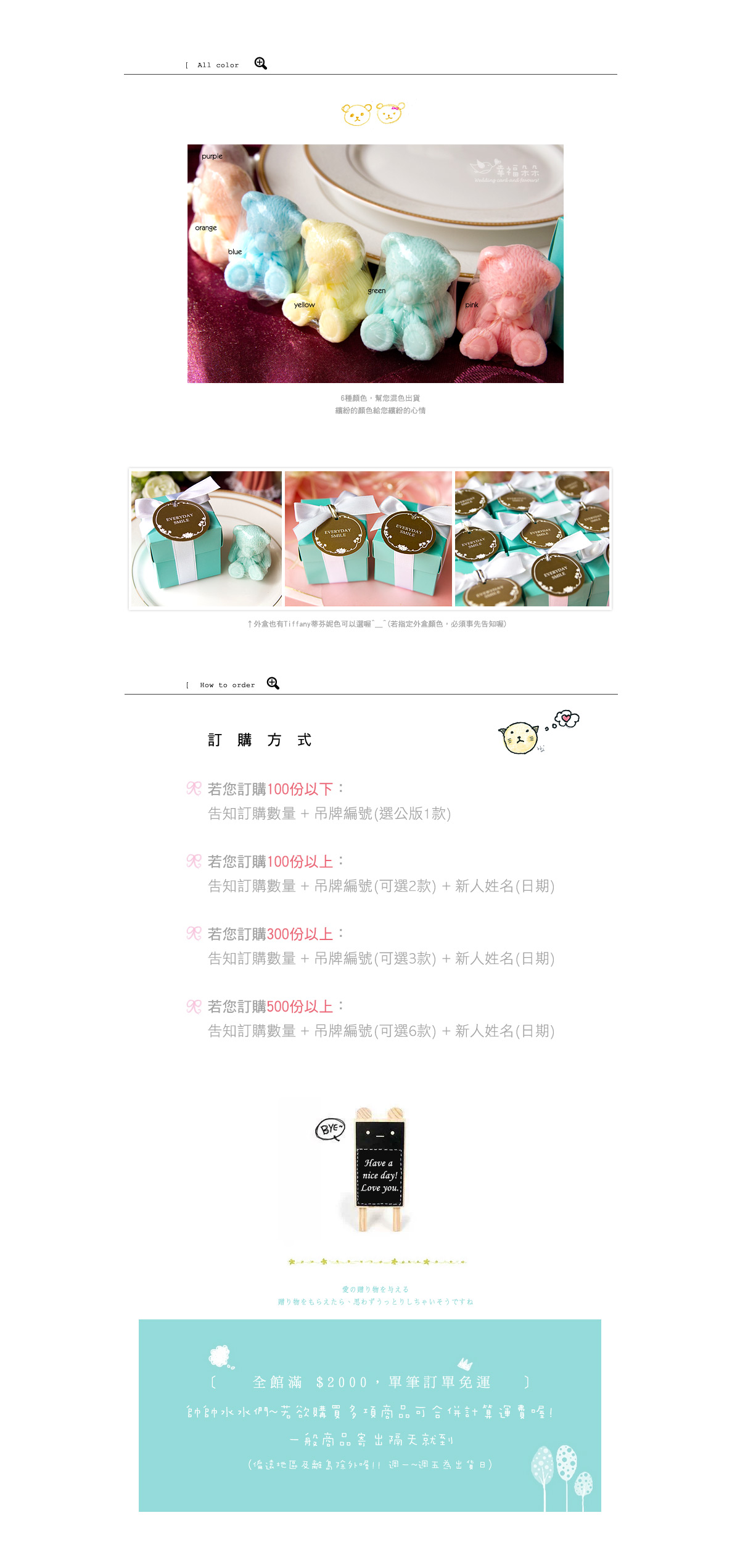 | 加購折扣 | 婚禮小物滿2000免運,可與喜帖婚卡合併寄送∼免運! |