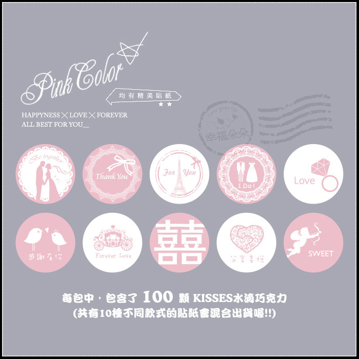 巧克力底部均貼有Pink婚禮主題貼紙喔! 每一顆都讓親友有驚喜感,讓他們感受到你們的甜蜜吧! 皆為混合口味出貨,恕不挑口味唷~