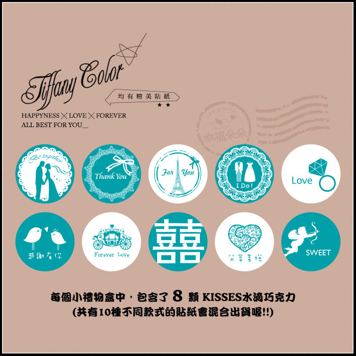 巧克力底部均貼有Tiffany婚禮主題貼紙喔! 每個小禮物盒中,包含了8顆水滴巧克力。 每顆都讓親友有驚喜感,讓他們感受到你們的甜蜜吧! 皆為混合口味及隨機款式出貨,恕不挑口味及款式唷~