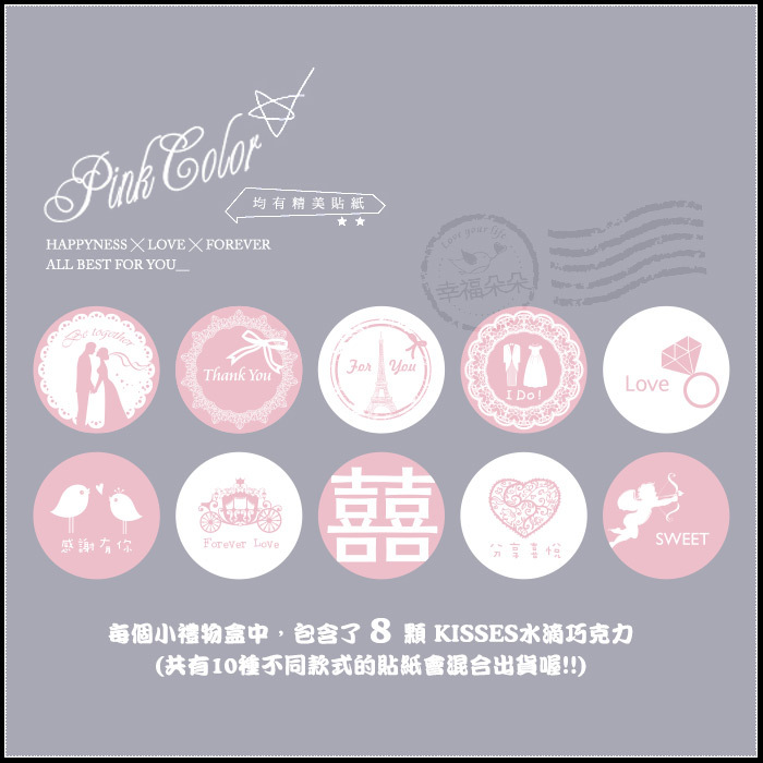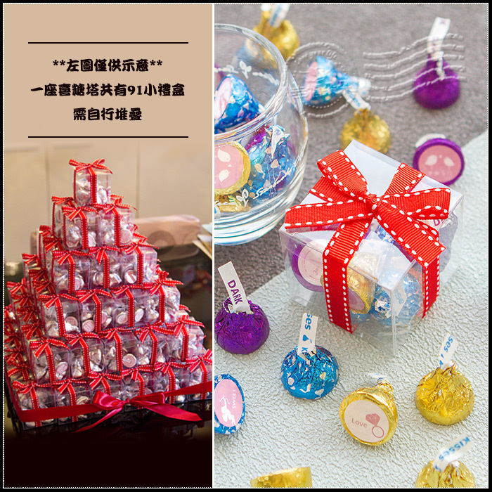 好時最吸睛獨特的水滴巧克力,單顆包裝小水滴方便拆開食用不沾手,適合獨享也適合親友歡聚時分享。 此喜糖塔共有6層,是由91盒KISSES水滴巧克力小禮盒所堆疊而成,隨貨附贈一條180cm寬版紅色裝飾緞帶,您可在堆疊完成時自行打在最下方那層喔! 巧克力底部均貼有Pink婚禮主題貼紙喔!每個小禮物盒中,包含了8顆水滴巧克力。每顆都讓親友有驚喜感,讓他們感受到你們的甜蜜吧! 共有3種口味:牛奶巧克力(金色鋁箔包裝)、黑巧克力(紫色鋁箔包裝)、巧酥可可巧克力(藍色鋁箔包裝) 皆為混合口味及隨機款式出貨,恕不挑口味及款式唷~