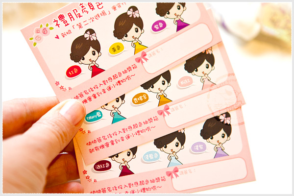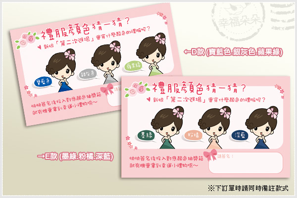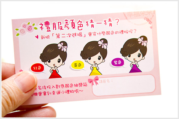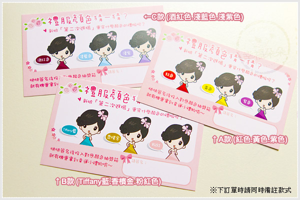 *使用方式:新娘禮服顏色猜猜卡,可以在二次進場時,集中大家的目光焦點~ 讓大家猜猜看,美麗的新娘子會穿什麼顏色的禮服呢? 請賓客簽名並投入對應顏色的禮服抽獎箱,從中抽出中獎者,可拿到幸運小