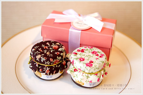 *透明盒裝瑞士最有名的Hero小蜂蜜,搭配可愛小碎花的布帽有米色及咖啡色底,絕對是超夯的婚禮小物喔。