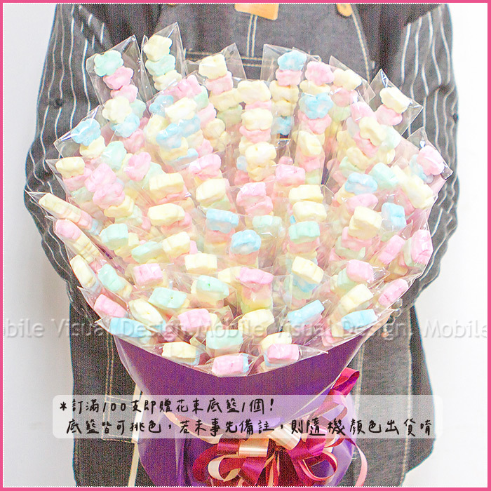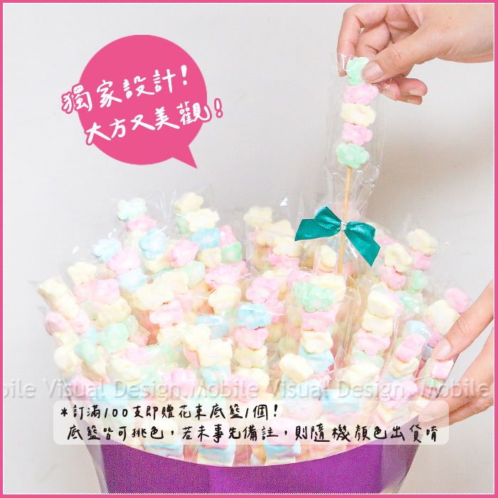 *此商品是由5顆小花棉花糖串起,全程採用乳膠手套製作,並使用熱封封口機連同竹籤整支封起,安全衛生👍