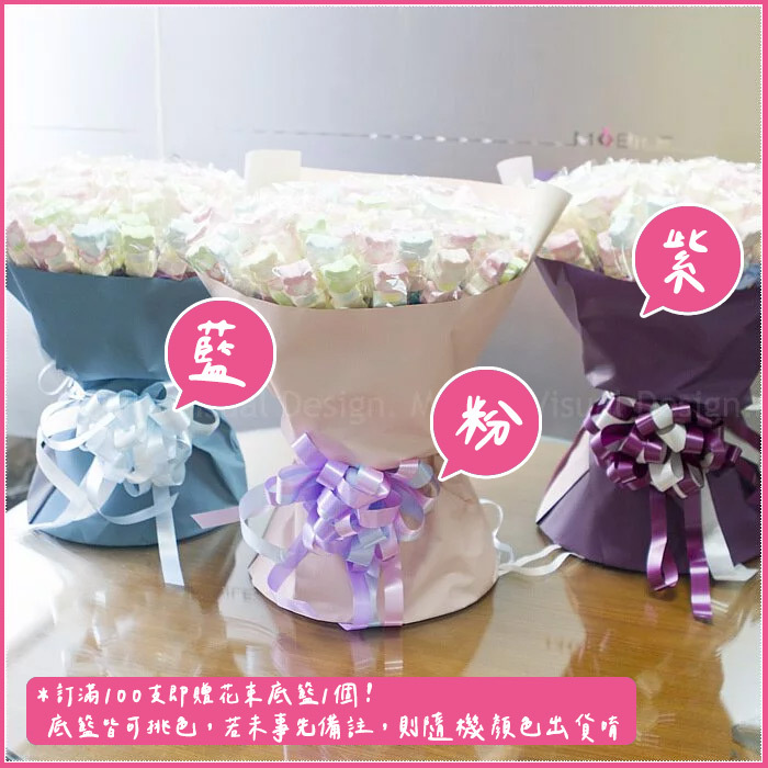 *凡單筆訂單滿100支即贈「獨家設計」花束底籃1個喔 👉1個可裝下100支 *底籃有粉色、藍色、紫色共3色可挑!(底籃若未事先備註,則隨機顏色出貨唷) ⚠️⚠️⚠️此商品需自行DIY裝入⚠️⚠️⚠️