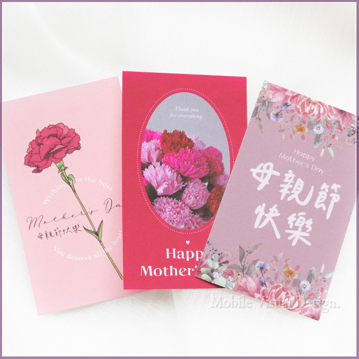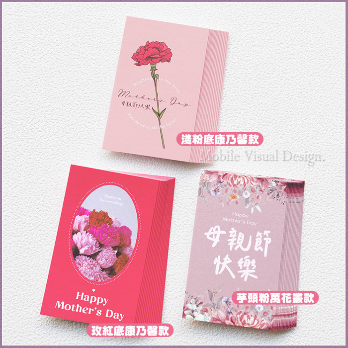 *象牙卡,單面彩色印刷;背面空白可自行寫上想說的話唷♥ 共有③色可挑:淺粉底康乃馨款、玫紅底康乃馨款、芋頭粉萬花叢款